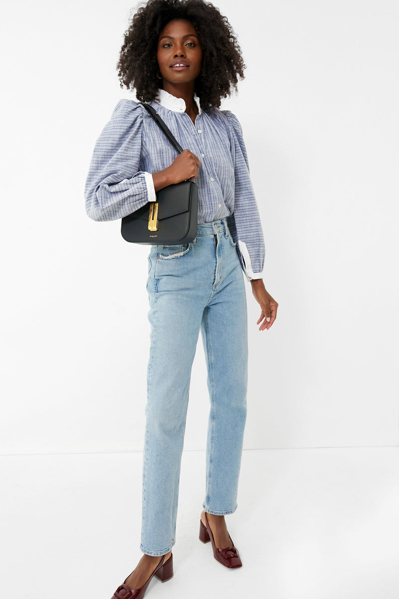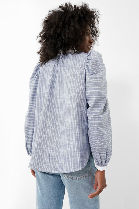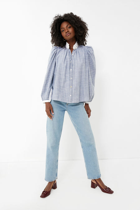 Adorned with subtle pinstripes, the charming Blue Chambray Annabel Shirt is a staple in any season. Finishing touches include a contrast ruffle collar, subtle puff shoulders, mother of pearl buttons down the placket, and a floaty fit that all come together to create an understated but elegant top. Made of lightweight cotton, this style is beautifully paired with trousers for an elevated ensemble or tried-and-true denim for a retro-inspired boho-chic look.