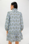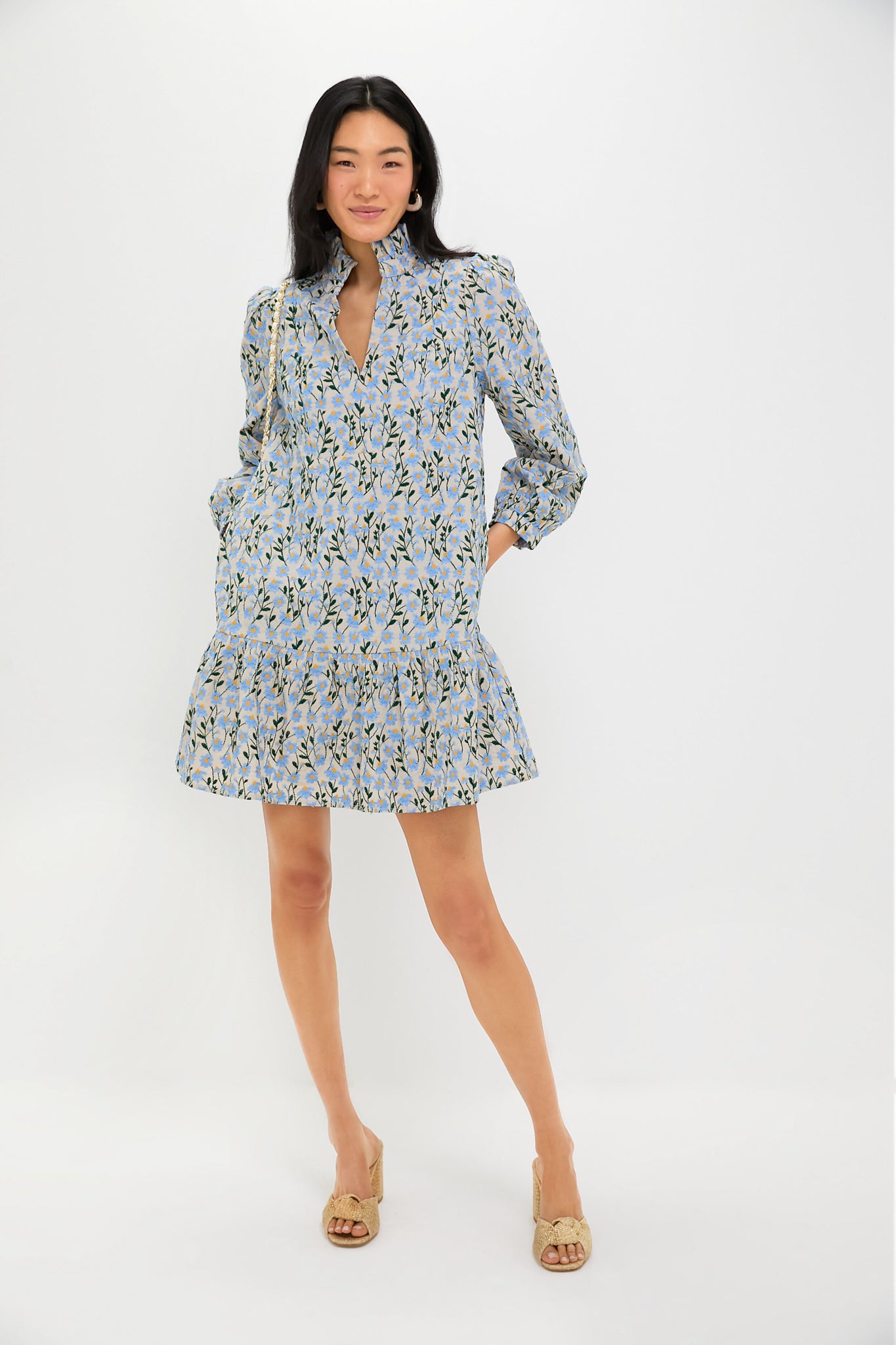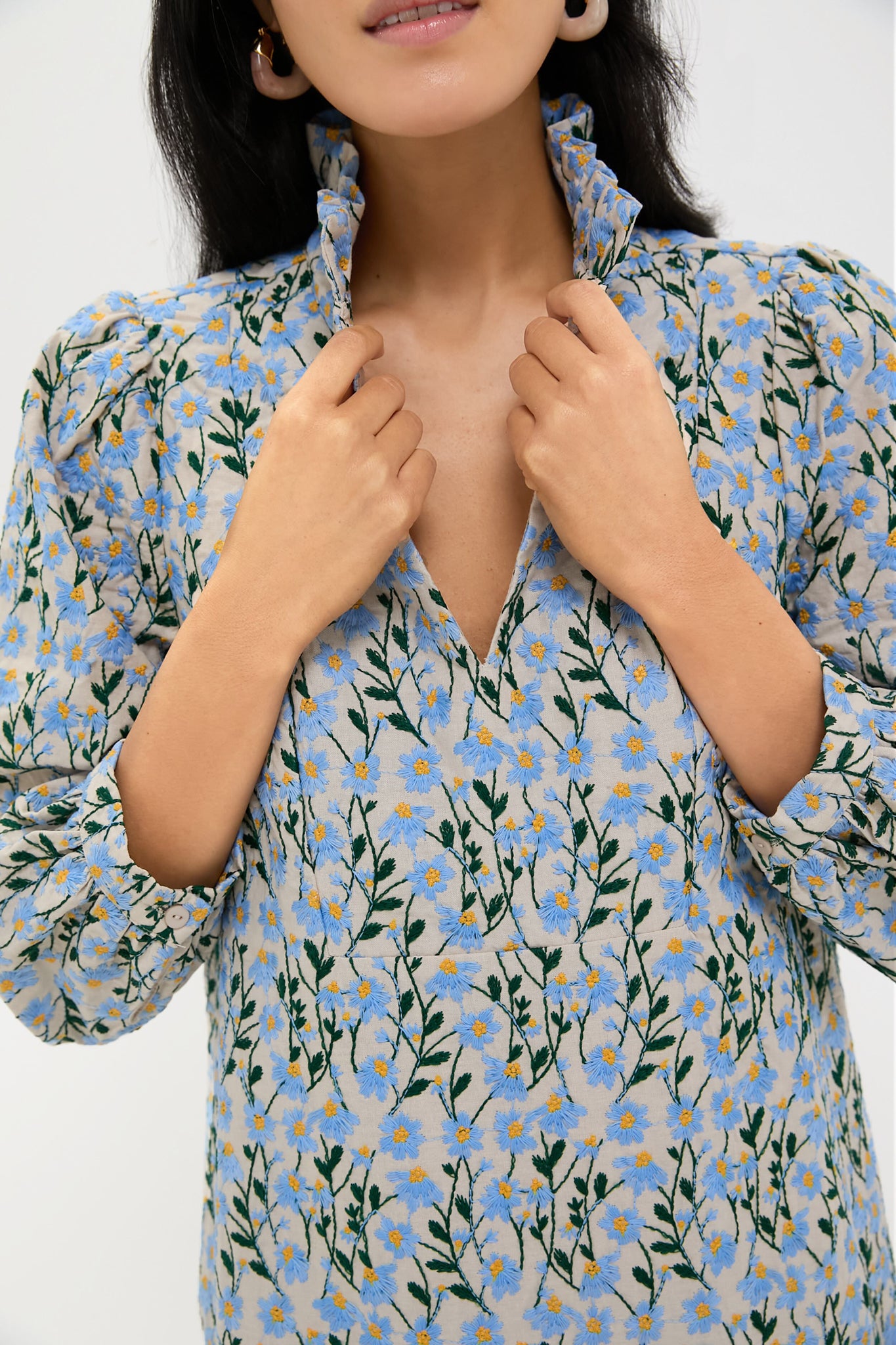 The Blue Daisy Embroidered Palmerston Dress offers a ruffled collar and long sleeves for a sophisticated, yet fun feel. With playful blue and green floral pattern, you can wear this number during the day with ballet flats or at night with heels! We chose to style it with raffia heels, a mini bag, and fun earrings!