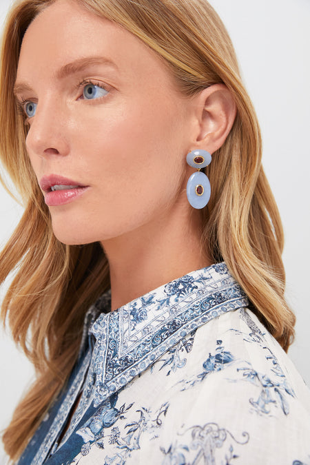 The Blue Dorothy Earrings bring an architectural grace and bold color combo to your everyday accessories. With angelite stone double drops inlaid with semiprecious pink rhodolite, these are perfect for adding a touch of color or a hint of shine to a basic look.