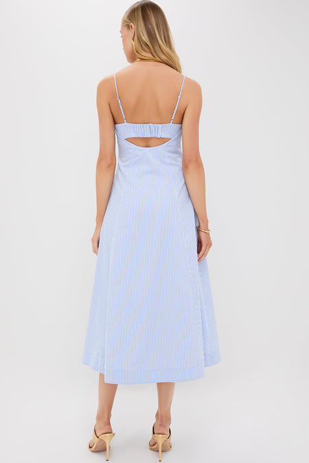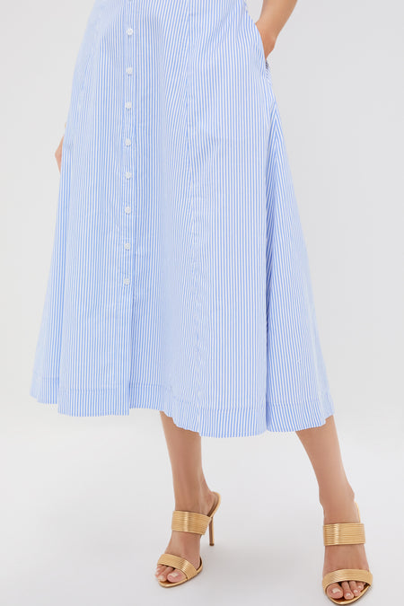 The Blue Hydrangea Honor Dress blends crisp tailoring with relaxed femininity. Crafted from striped novelty shirting fabric, this graceful cami midi features a flattering fitted bodice and a flowing A-line skirt for a refined, elegant look. Whether you're heading to the office or a weekend brunch, pair it with ballet flats for a chic daytime look or strappy heels for an elevated touch.