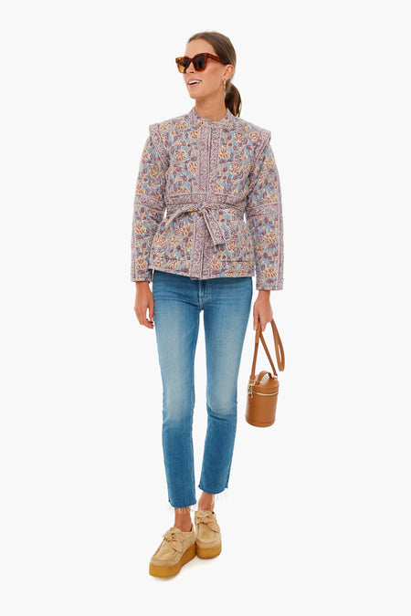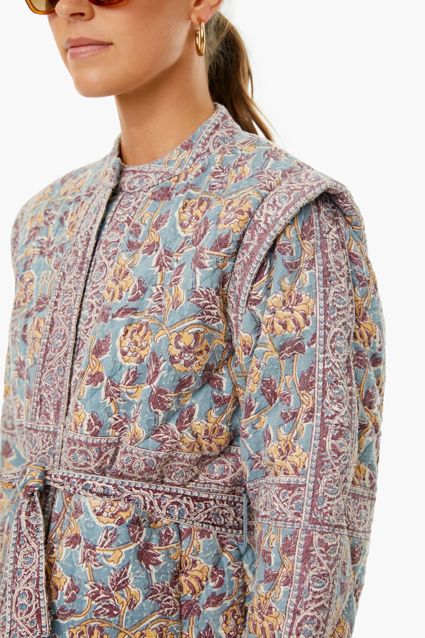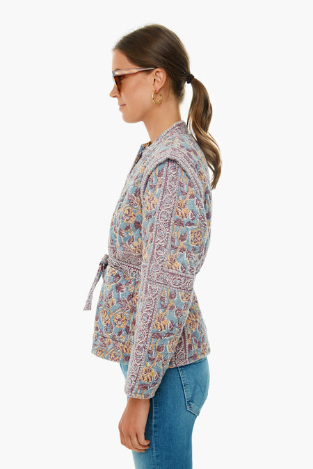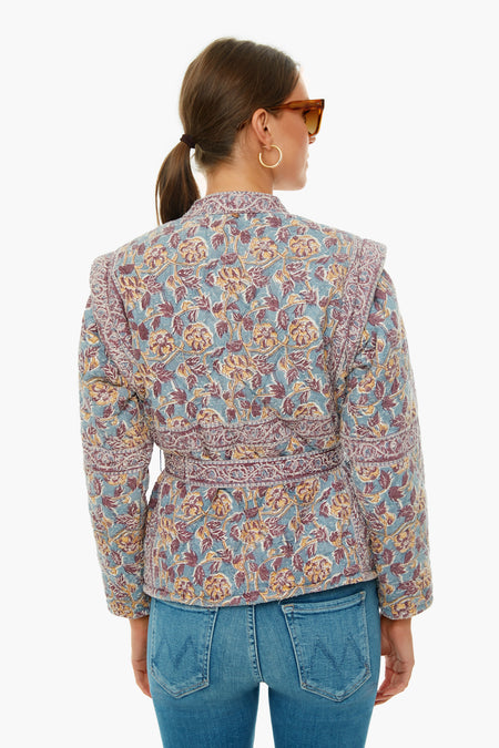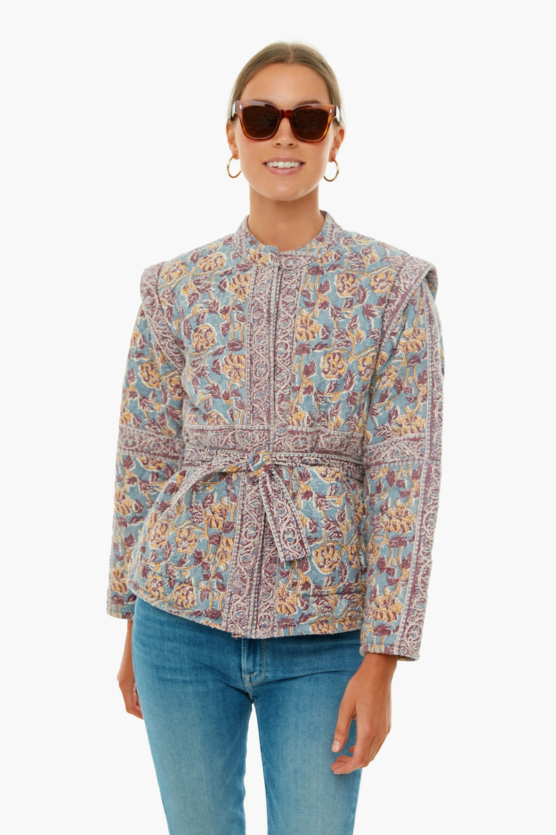 The Blue Jacquard Fanny Jacket is made from mixed patchwork prints with quilted details. Featuring shoulder pads for added structure, side pockets, snap closures, contrast printed lining, and a self-tie belt, this style is unique with a vintage feel. Pair with denim and gold jewelry for lunch with friends.
