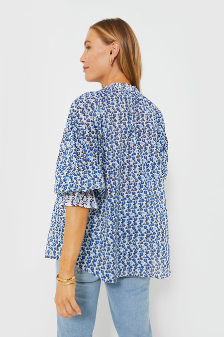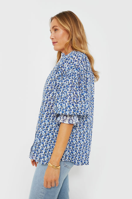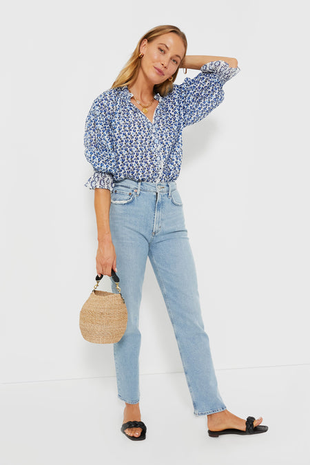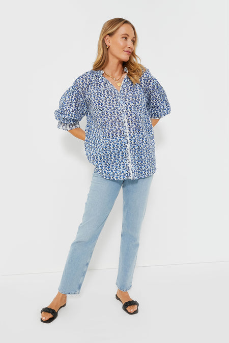 In that perfect blue and white color palette we all love for this time of year, the Blue Lavinia Rachel Shirt is effortless and exudes relaxed femininity. A ruffled collar and cuffs provide a hint of maximalism that complements the simple button down placket and rounded hem and makes this top feel extra special. Pair with any shade of denim, as well as sandals or sneakers — this summer style staple looks good with anything.
