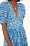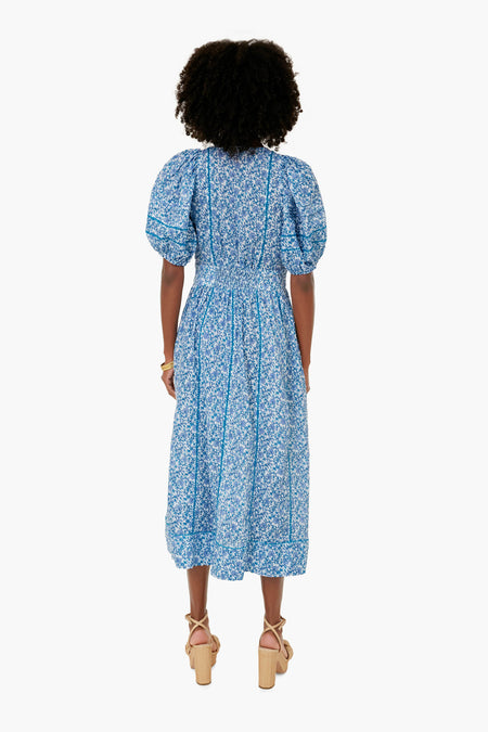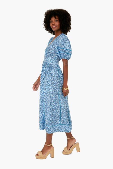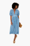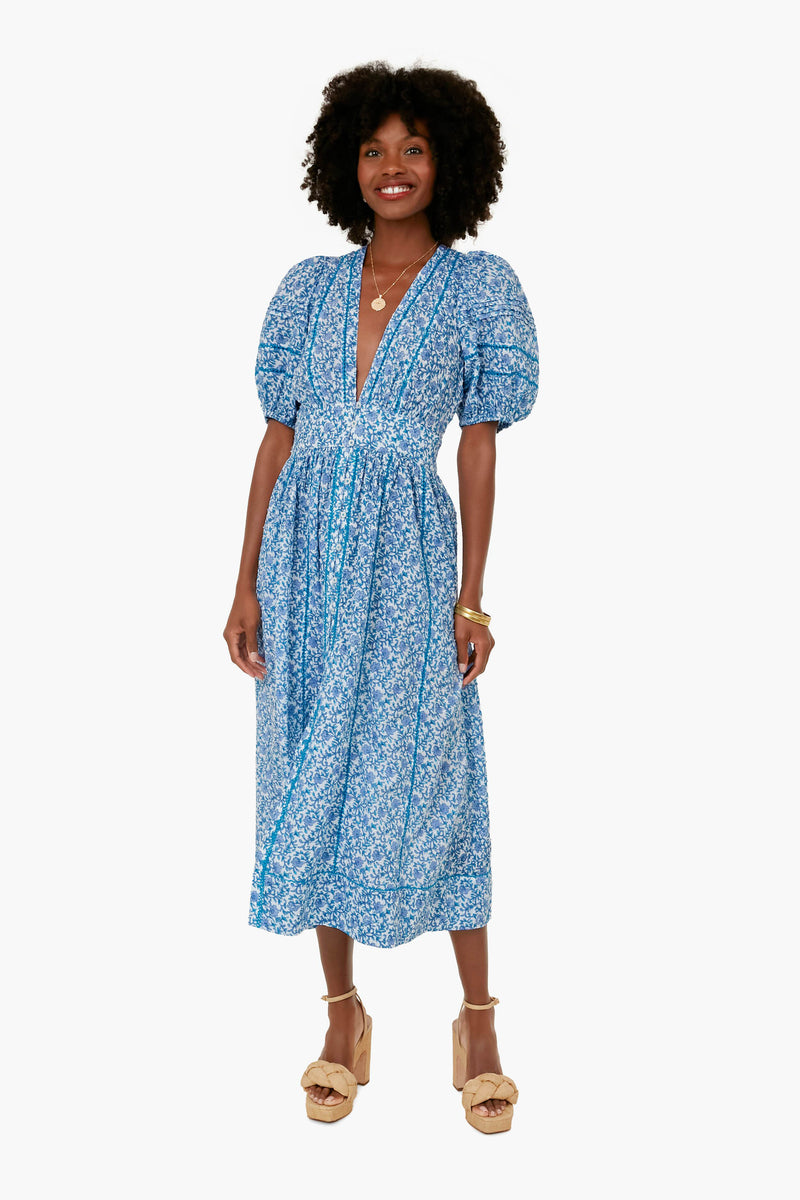 In a stunning blue floral print, the Reine Dress is a warm weather must-have. With a dramatic deep v-neckline and short balloon sleeves, this breezy cotton midi is a perfect and playful sundress for any occasion. Style with sandals and a tote bag for daytime activities on the go, or wear with heels and statement jewelry to be the best dressed wedding guest.