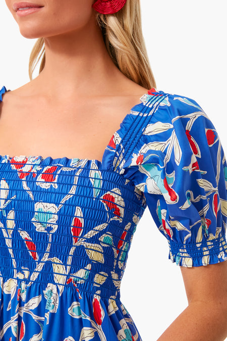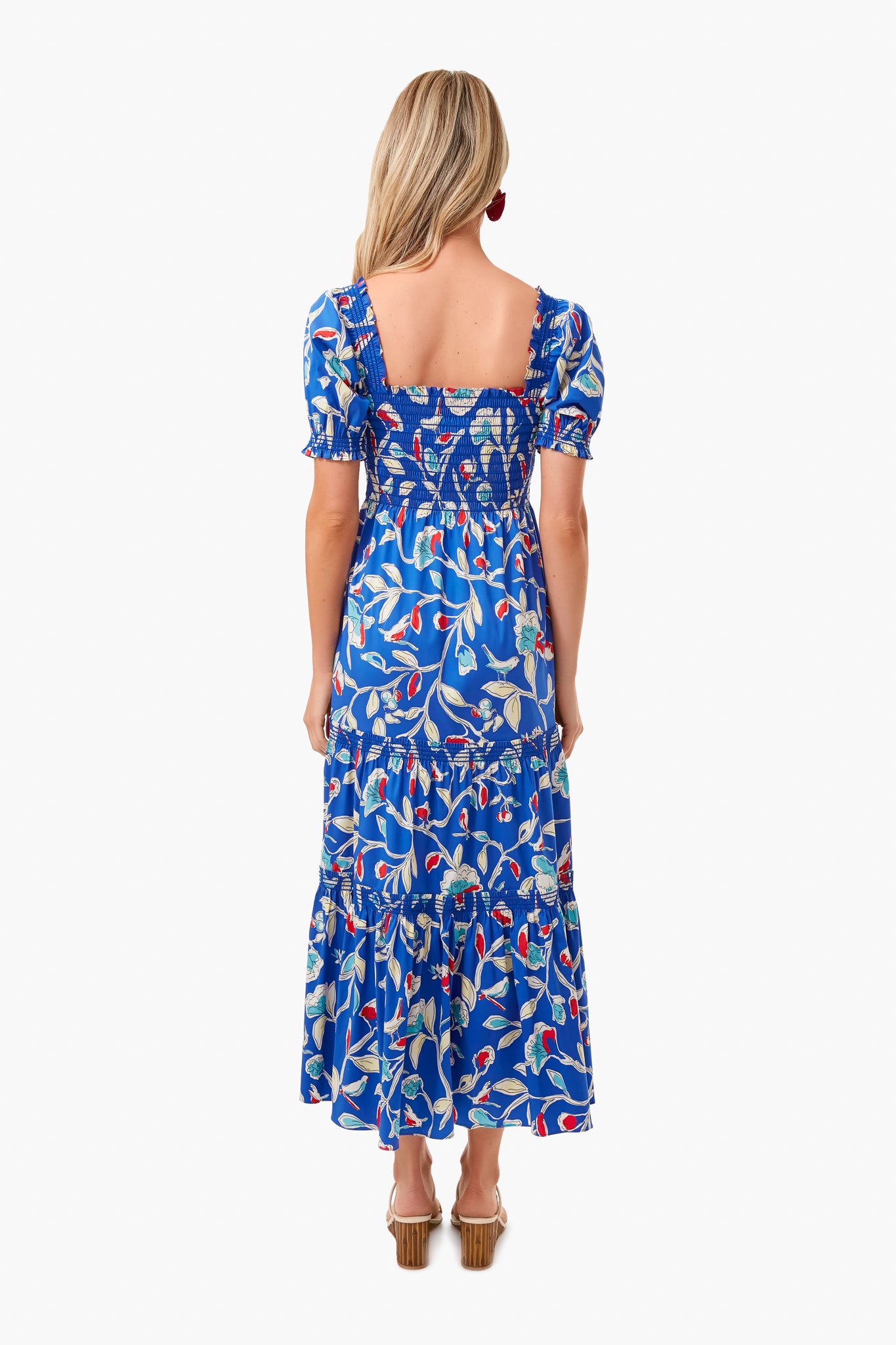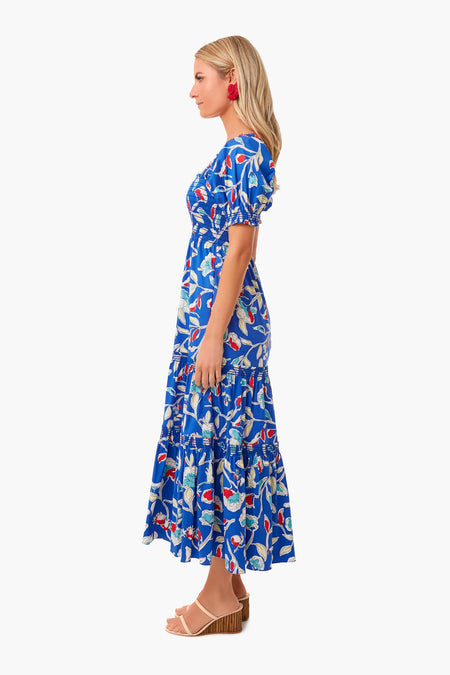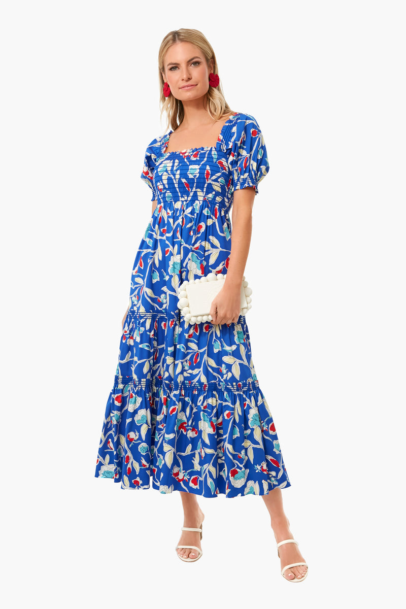 The Blue Painted Roses Smocked Midi Dress is made from a beautiful blue floral print. Featuring a square neckline, tiered skirt, and smocked top, this style can be worn on or off the shoulder. Add sandals and sunglasses for an easy, casual, summer look.