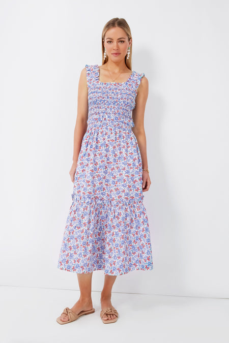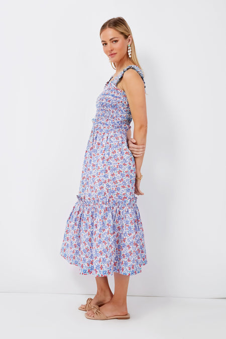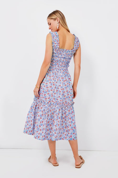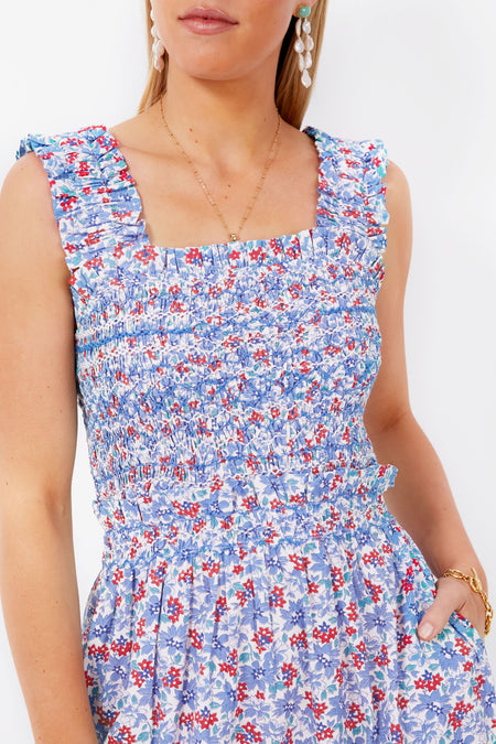 In a ditsy print that we are dreaming of this season, the Peggy Floral Dress is full of super-saturated hues of blue and red. This spectacular silhouette features wide, ruffled shoulder straps as well as a hand-smocked bodice and a breezy midi length hem that is perfect for wearing on park picnics and tropical getaways alike. Pair with sandals and sunnies for an easy look with summery feel, or with white sneakers and a tote for an effortless daytime ensemble that will have you looking your best.