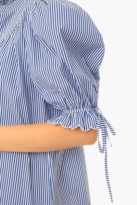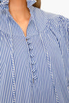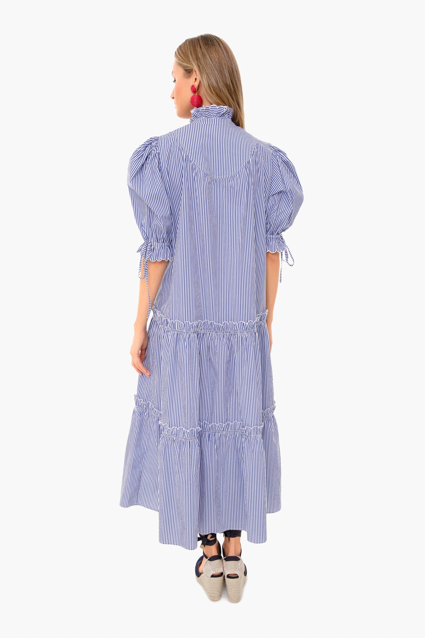 The Blue Stripe Holloway Dress combines coastal style with feminine details. This v-neck midi features tiered ruffle accents, quarter-length sleeves with ties, and a partial button placket with ruffled collar. Perfect for weddings and bridal showers, we are adding wedges and raffia earrings for an unexpected pop of color.