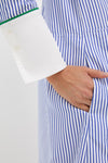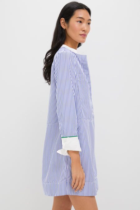 The Blue Stripe Rohan Shirt Dress is the elevated style staple your closet needs. With a contrast stand collar and elongated cuffs, front button placket, a classic shift silhouette, and front pockets, this playful and chic mini is perfect for any and everywhere. Pair it with sneakers while you run errands around town and switch to ballets for a casual office look.