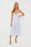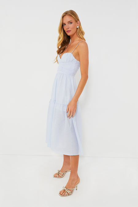 Be a blue beauty in the Blue Stripe Sasha Midi Dress by O.P.T. With a sweetheart neckline, ruched bodice, and tiered skirt, this style is nothing short of absolutely flattering. The perfect midi to dress up or down, we are pairing it with wedges and a tote for a casual dinner time look, or pairing it with heels and pearl necklace for a more elevated event.