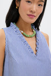 The Blue Striped Veronica Top is the elevated tank that you'll be reaching for all season long. Unfussy and feminine, this blouse features subtle ruffle detailing along the V-neckline for a bit of flirty flair while keeping it sophisticated. We are wearing this sleeveless stunner with denim, trousers, mini skirts (must we go on?) from work to play with ease and style.