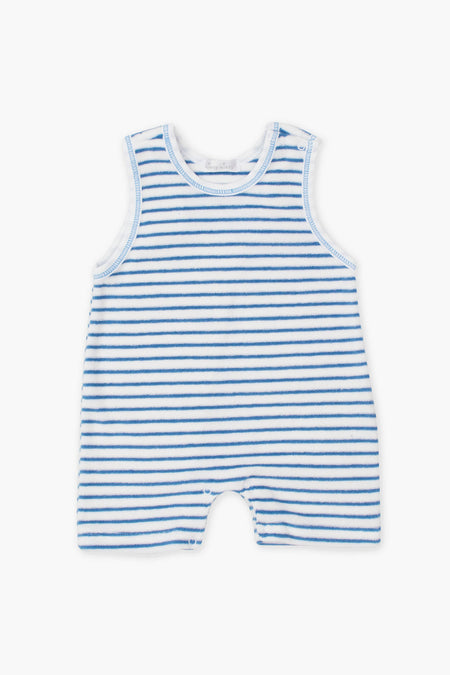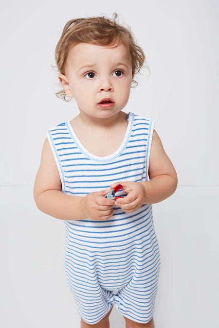 Your baby will be ready for the beach and beyond in the Blue Terry Sleeveless Play Overall. Sweet stripes lend a nautical vibe to this one-piece, sure to keep your tot cool and covered while under the hot summer sun. Cut from the softest fabric, the brand uses special Peruvian Pima cotton that has a longer fiber length which results in a more durable fabric and luxurious texture. You can count on your little one loving this onesie, they won't be itching to take it off!