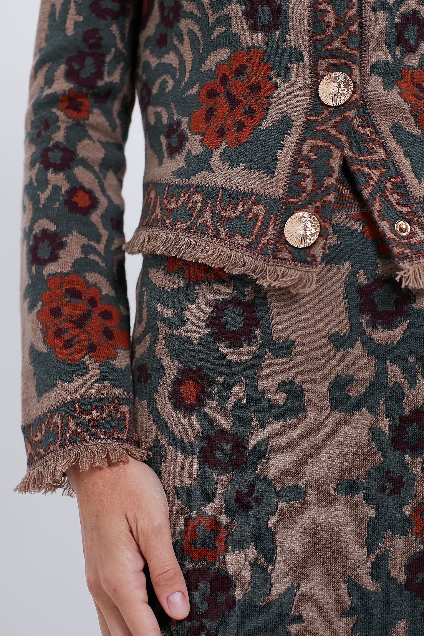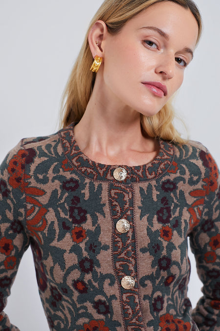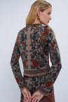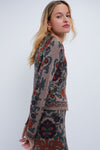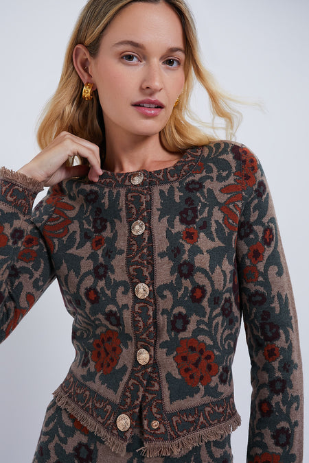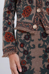 The Bogata Scarf Coco Livi Jacket is an elegant top that looks as if it stepped off of a Renaissance canvas. With a striking scarf jacquard fabric and mini fringe trim detail, we are wearing this on repeat during the transition months. Pair with a black jeans and boots or with the matching Bogata Scarf Coco Clara Skirt and heels.