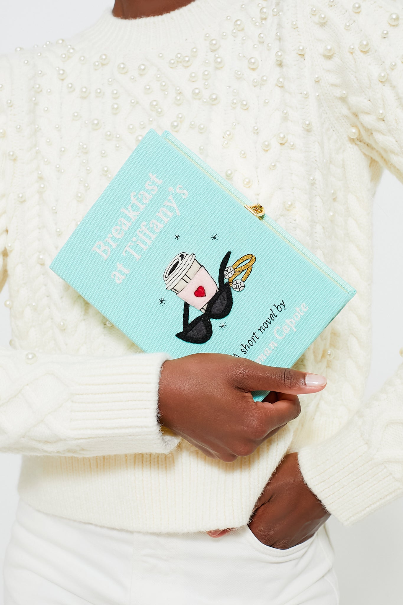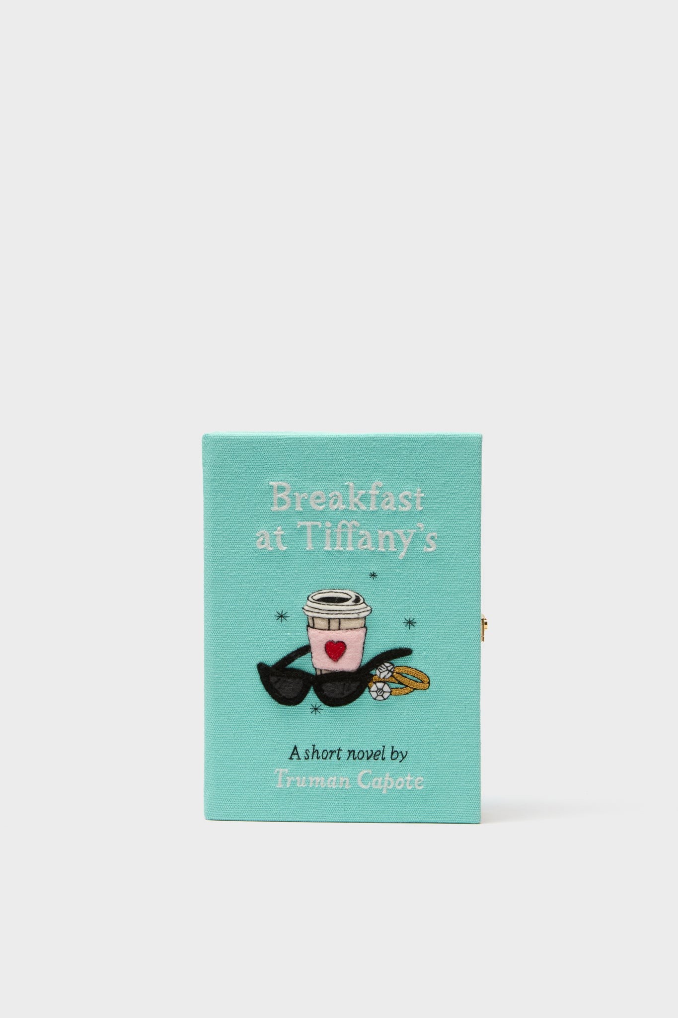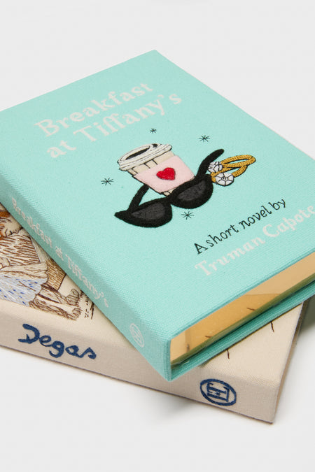 The Breakfast at Tiffany's Book clutch is a unique and eye-catching accessory that will instantly make you stand out. Designed to resemble a classic book, this iconic piece has a stainless steel frame covered with hand embroidered silk thread and felt applique. Perfect for book lovers and fashion enthusiasts alike, wear it to book clubs, or any special occasion to add a touch of whimsy and elegance to your outfit.