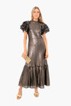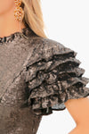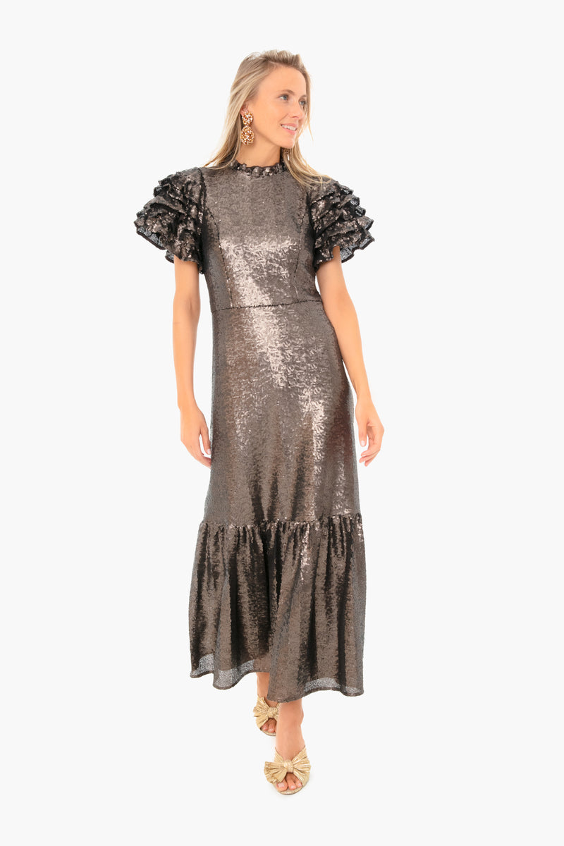 The Bronze Rachelle Ruffle Sleeve Gown features exaggerated ruffled sleeves, peplum hem, and all over shimmery fabric, making it a holiday must have. We are pairing it with gold accessories for a look that will be sure to stand out!