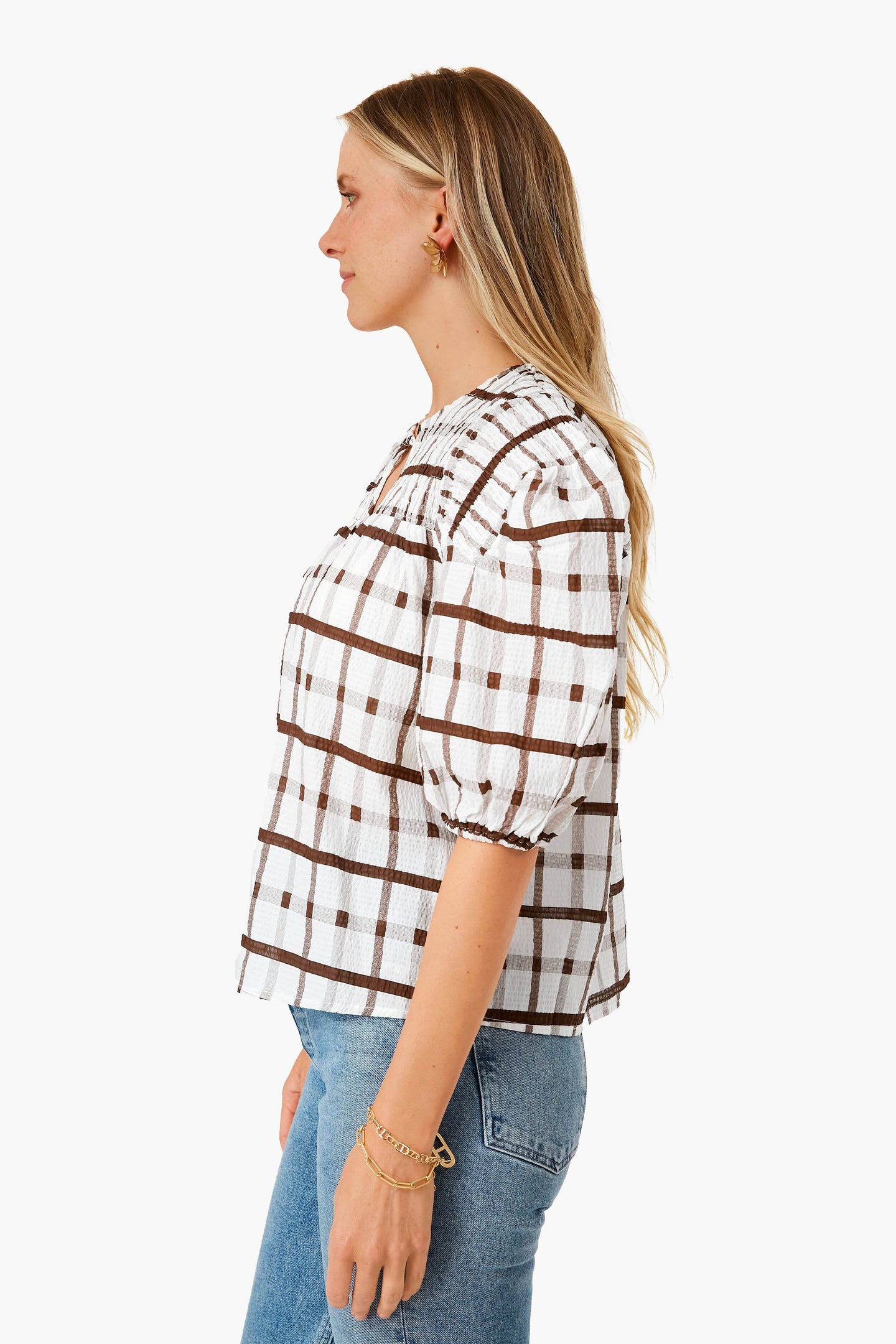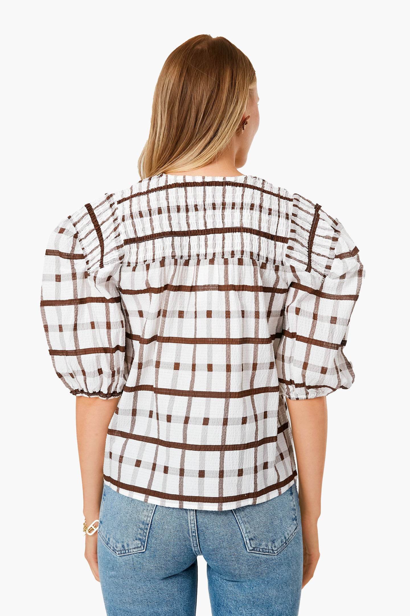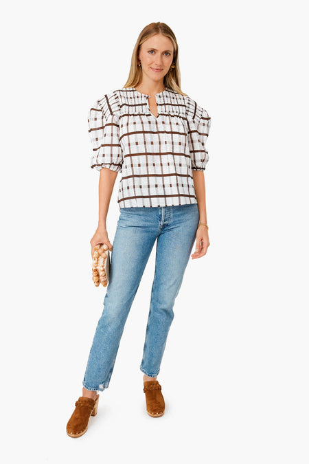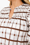 Never has there ever been a more sweet yet neutral silhouette than the Brown Grid Print Woven Top! In a rich brown check print, this puff sleeved blouse with smocking details brings fun, feminine elements while remaining effortless. We are loving this paired with denim and white sneakers for a casual look to grab coffees with friends, or with chunky heeled clogs and gold jewelry for a trip to the cider mill.