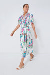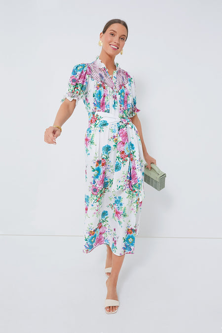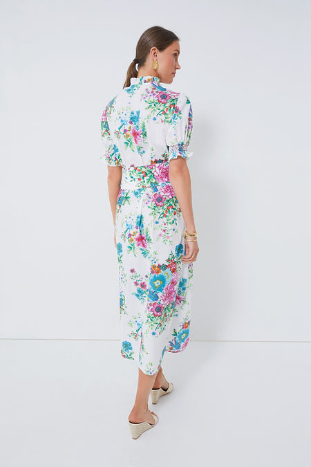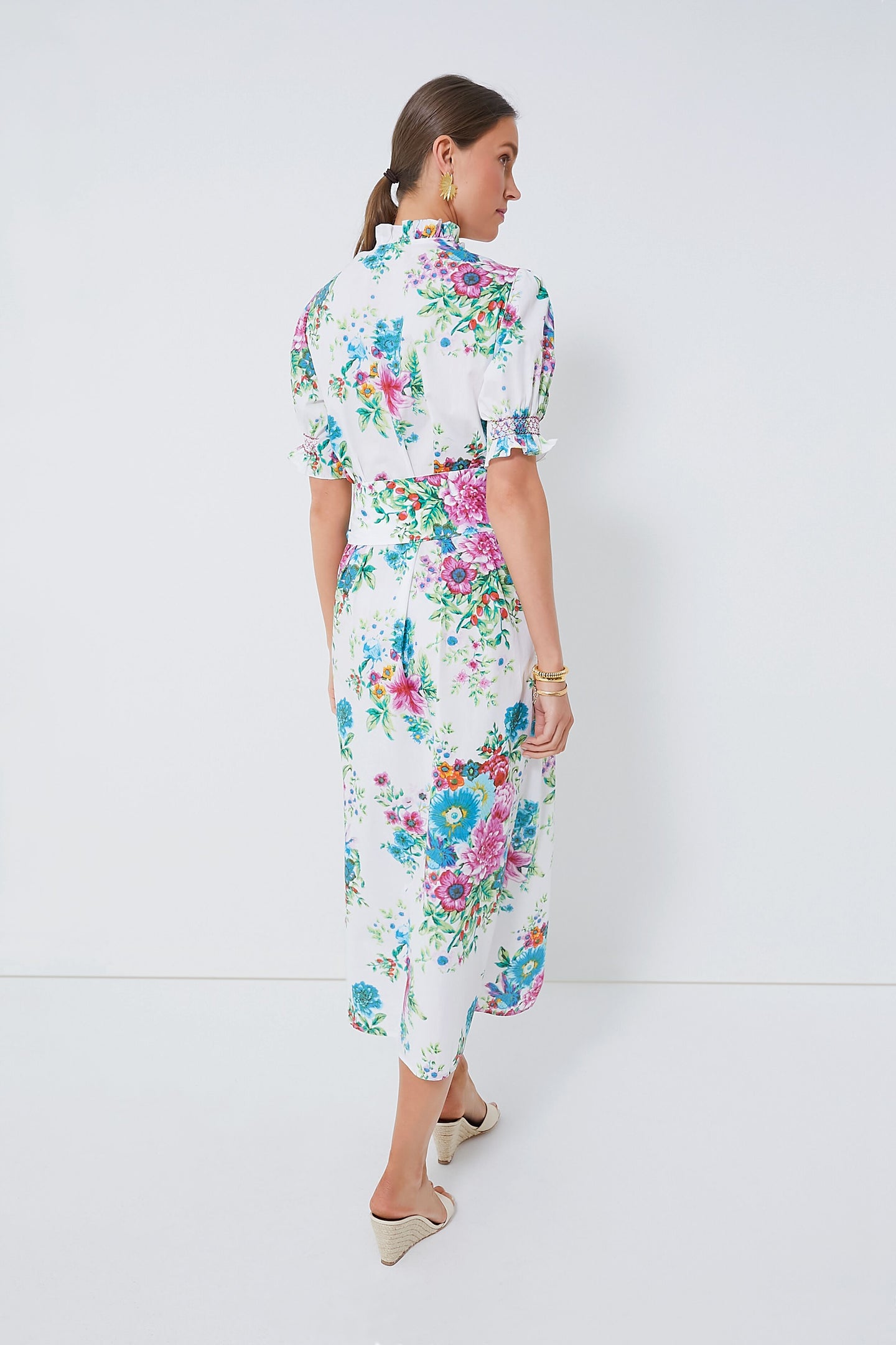 Add a pop of color to your look with the Bunches of Flowers Elena Dress. There is nothing like a stylish take on a shirtdress, and this cotton poplin number does it oh-so-well with a ruffled stand collar, contrasting hand-embroidery at the sleeve cuffs and yoke, and a self-tie belt which allows you to customize the shape. A truly magnificent midi, this silhouette looks fabulous for a dinner party with heels and statement earrings, at the office with flats, or at brunch with sandals and sunnies!