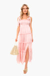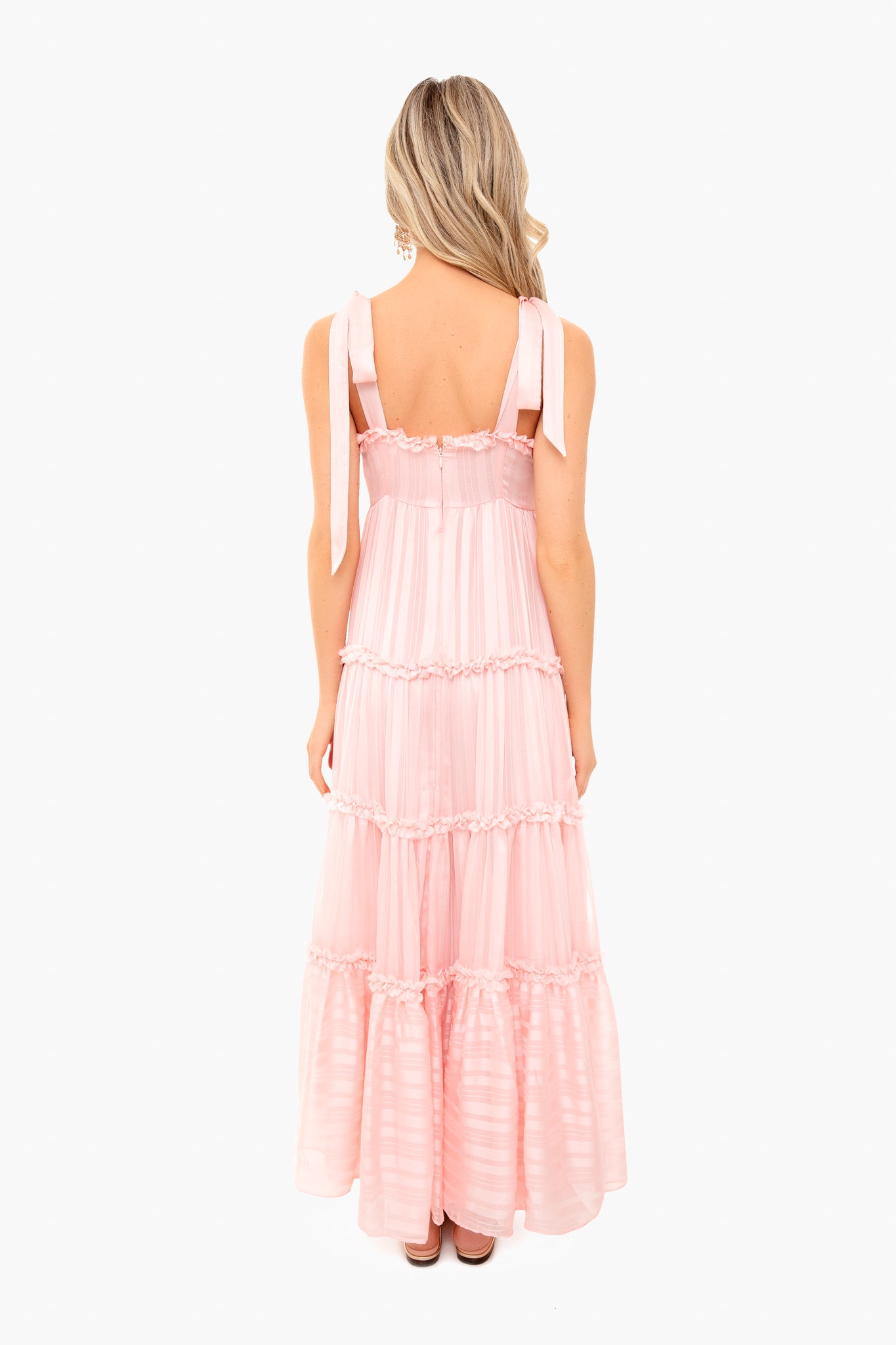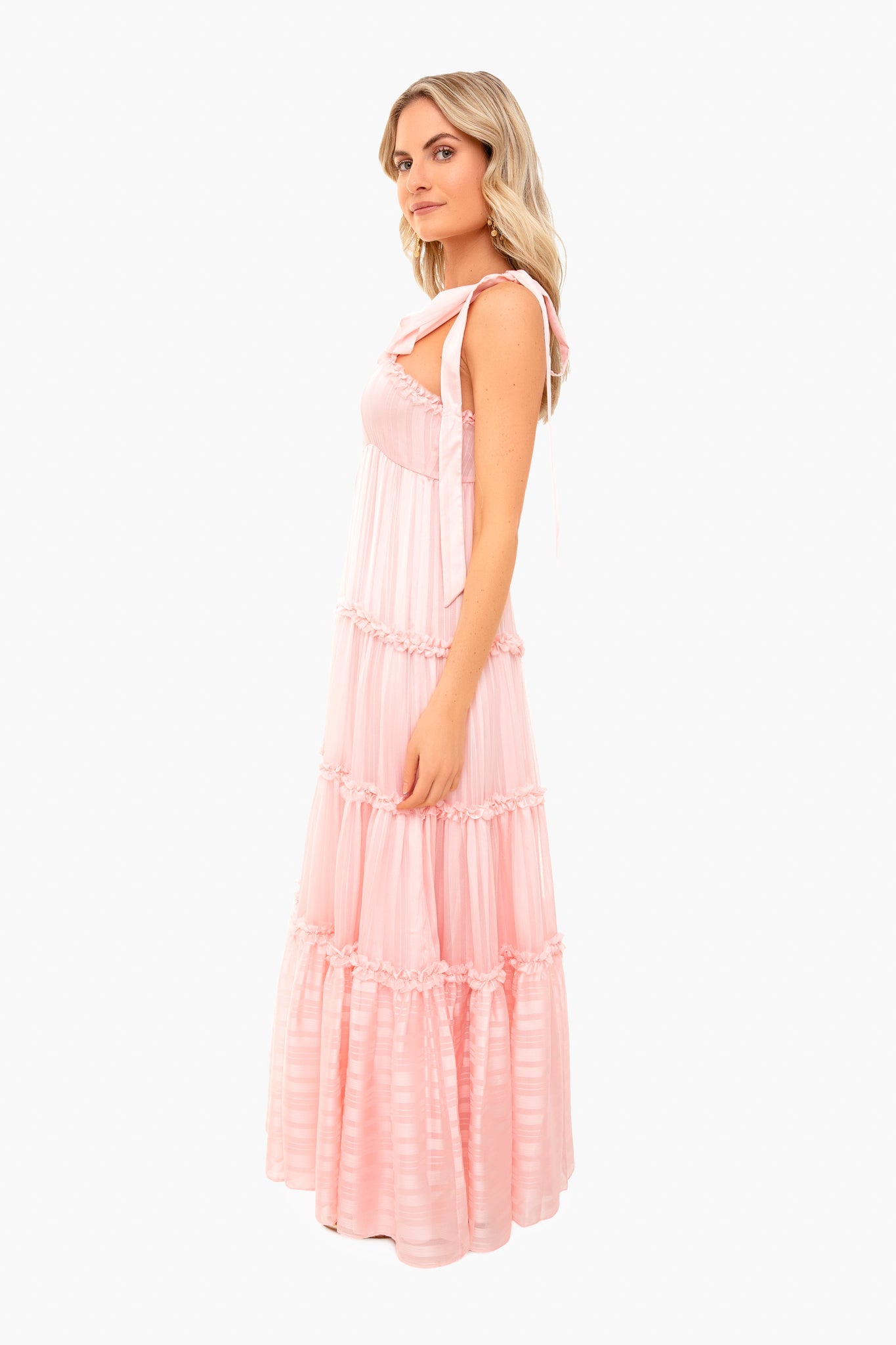 The Burrows Dress is made from iridescent striped fabric with elongated bows at the shoulders. Featuring shirred ruffle trim, a flattering empire waistline, and high slit, this gown is effortlessly romantic and glamorous. Pair with gold accessories for a glowing look!