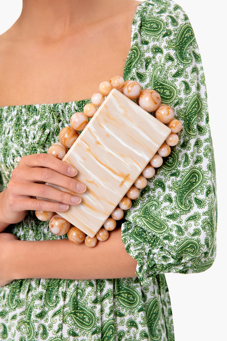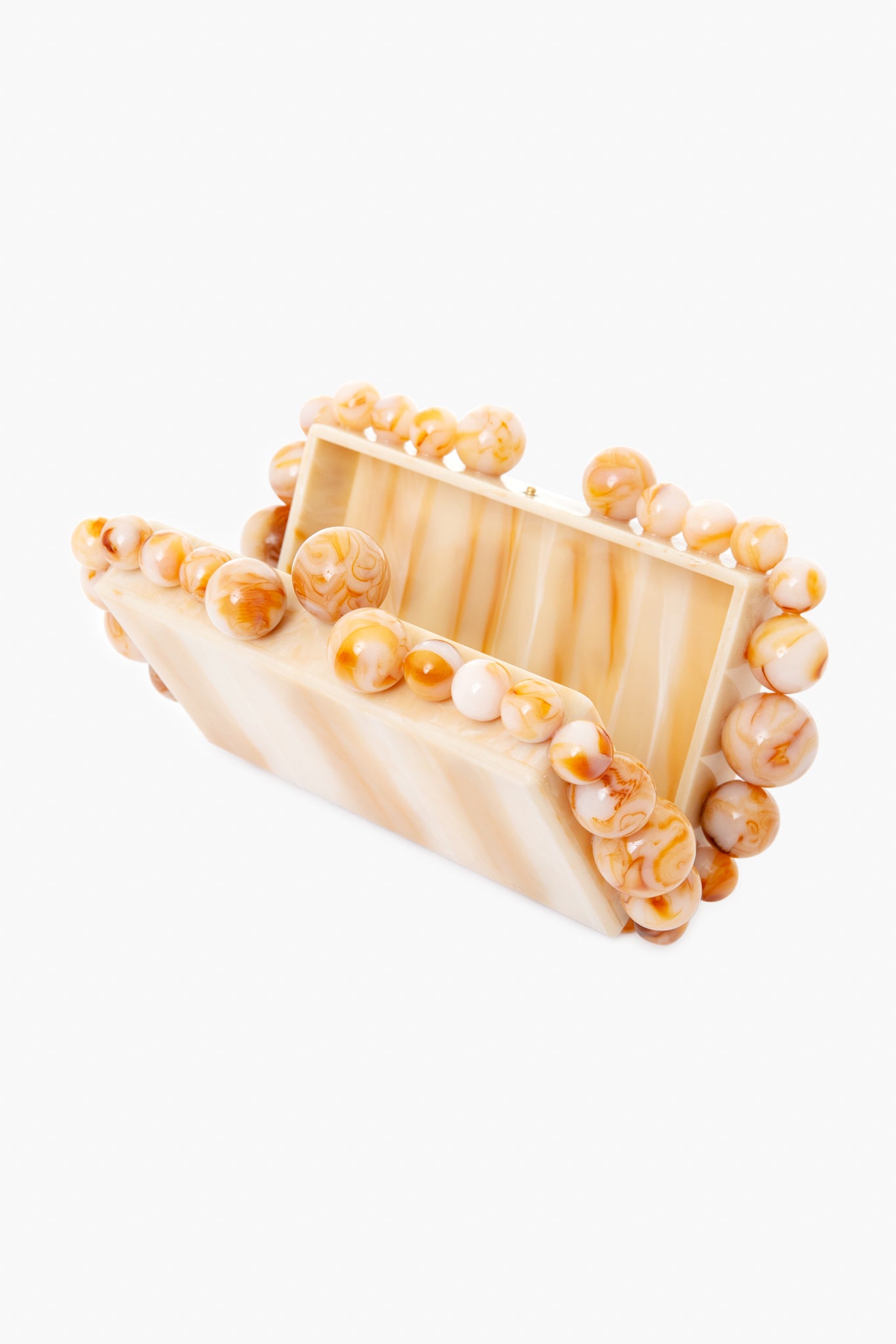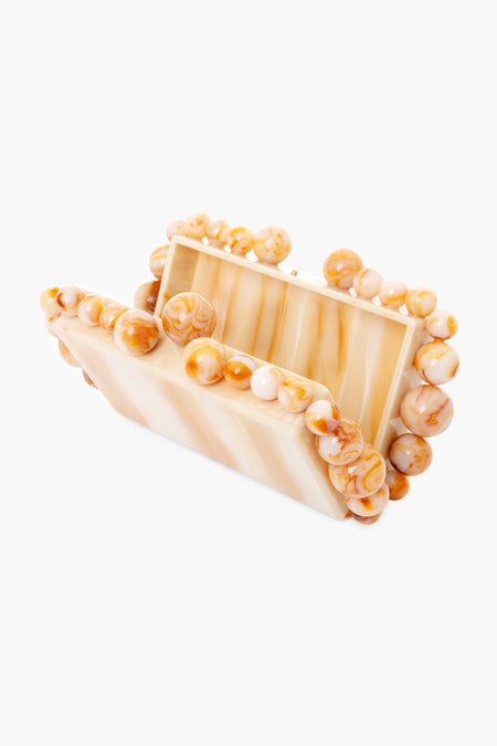 Featuring a faux mother of pearl façade, acrylic pearl beads around the edges, and gold Cult Gaia signature, this bag is a must-have. Pair with denim or a dress to add a little fun to your date night look!