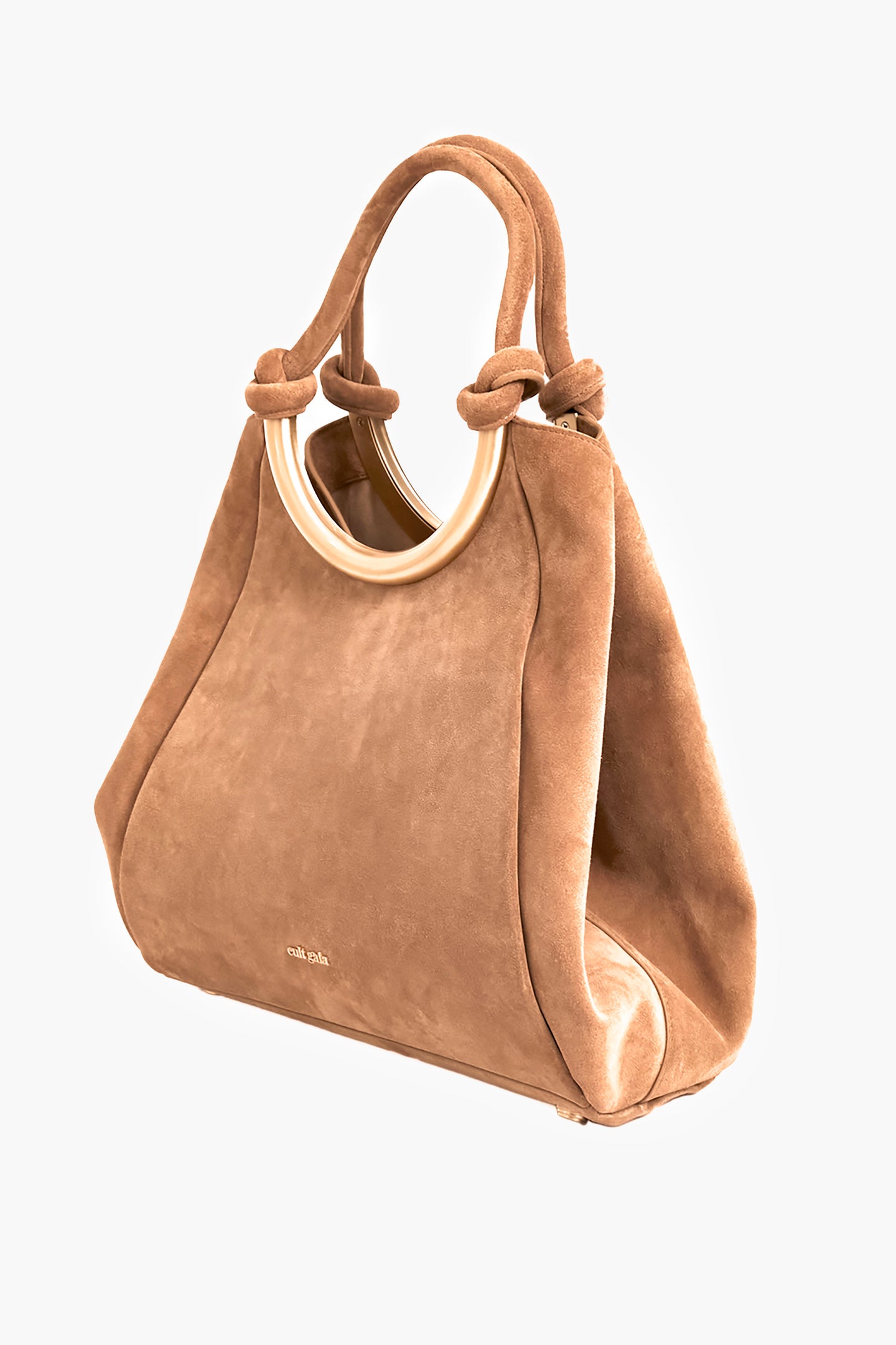 The Camel Nila Tote plays with geometric forms to create a stunning silhouette. In a gorgeous, luxe suede finish, this carry-all trapezoidal body is balanced by the circular shape created from the knotted, leather handles and a gold-toned half-ring that opens to the handle of the purse. A spacious interior means this style can carry all of your essentials, so bring it along to run errands or to be out all day exploring the city with friends.