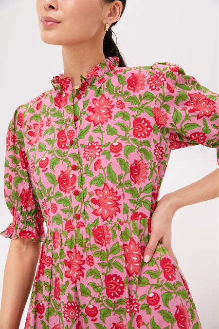 Screen-printed by hand on organic cotton and featuring romantic puff sleeves, a frill neckline and cuffs, this dress is all the thoughtful details. We are styling it with ballet flats, sandals, or heels for whatever the occasion calls for!