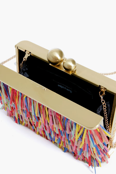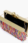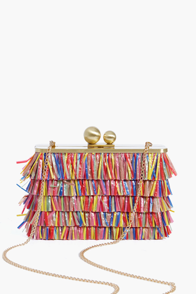 Flaunt this season's fringe trend with the Carlita Carnivale Raffia Clutch. Complete with a double ball top clasp, interior slip pocket, and a removable shoulder chain that allows you to carry this on your arm or in hand, we can't wait to see all the occasions you take this stunner too. Pair it with a colorful dress or an all white look for your next night out!