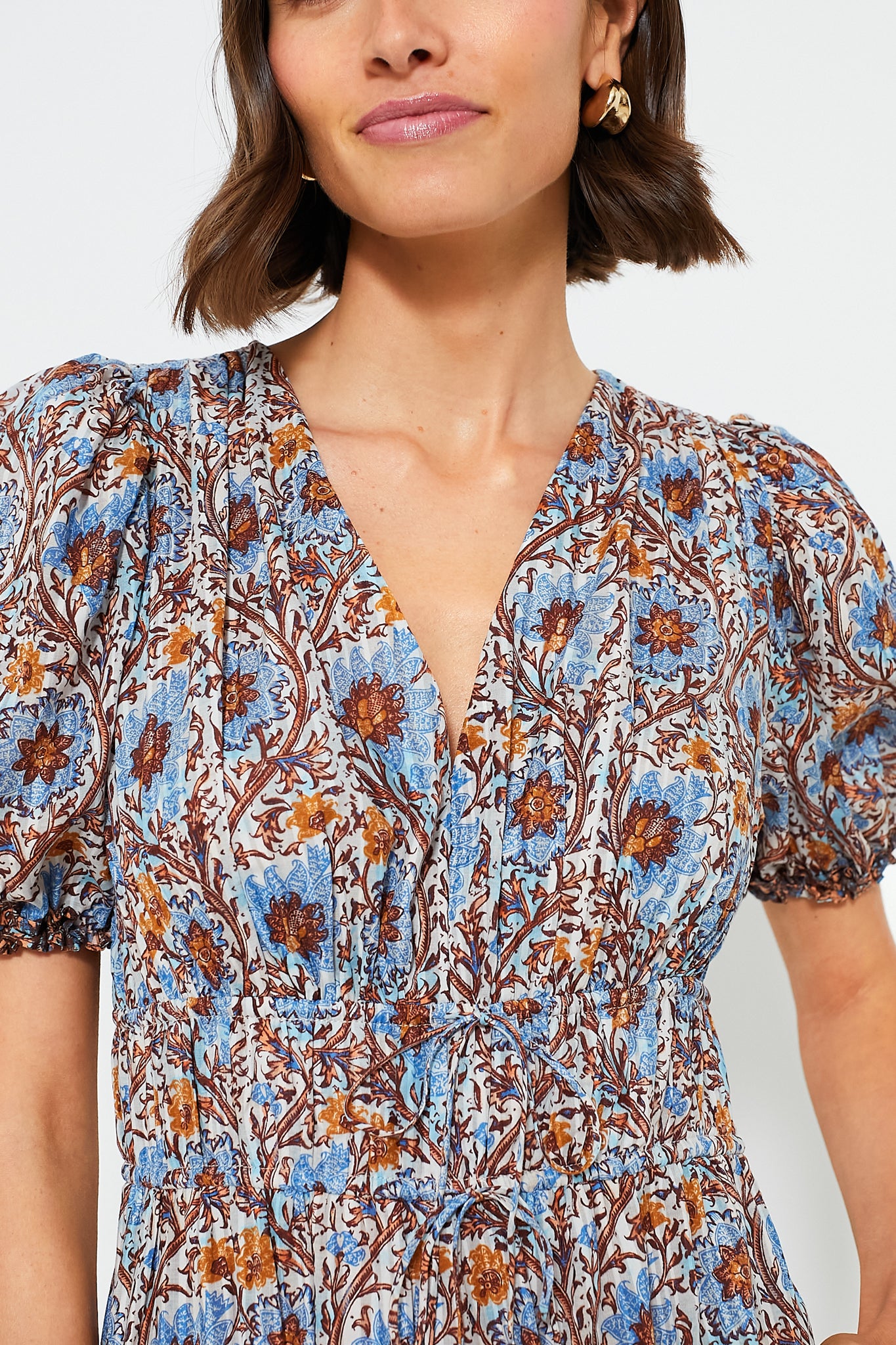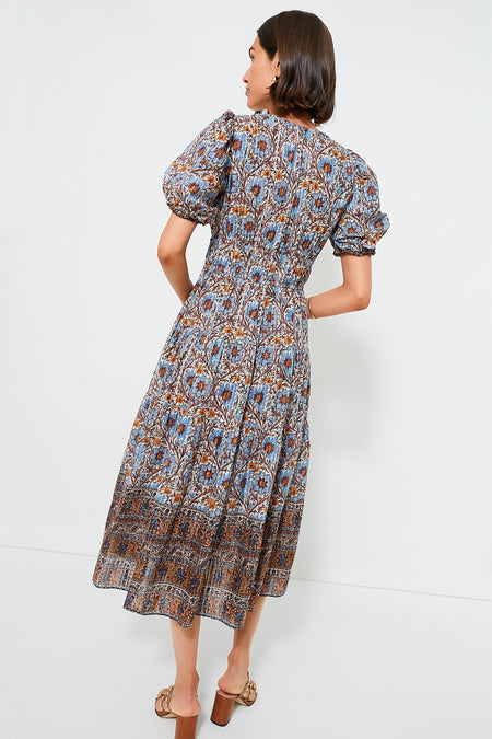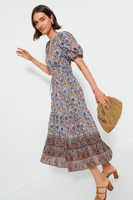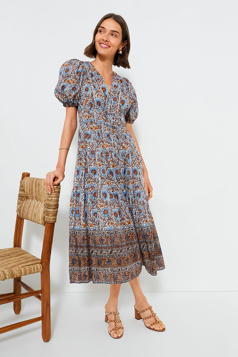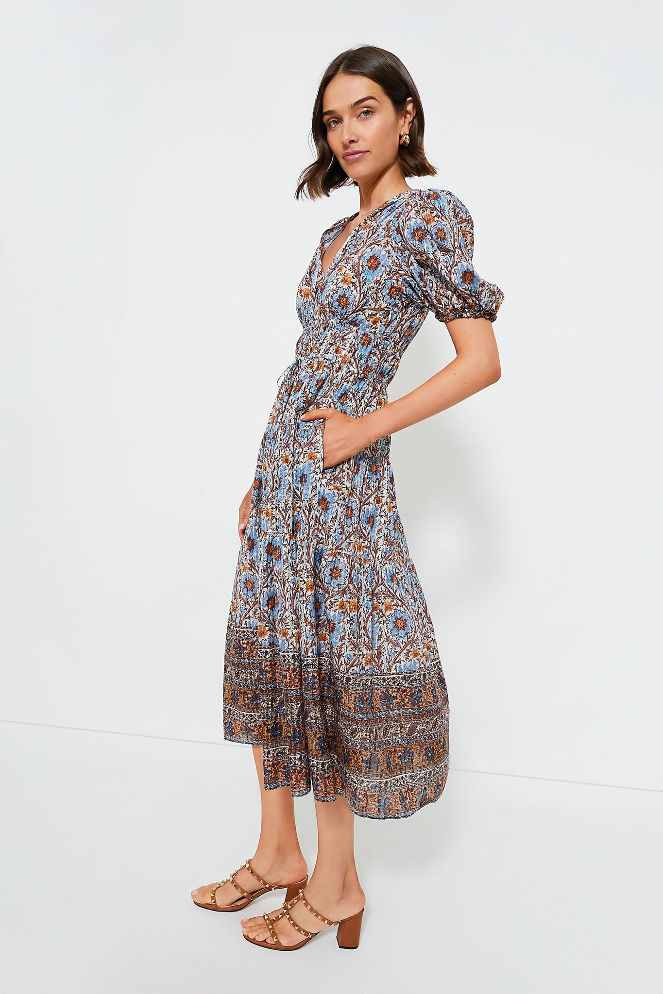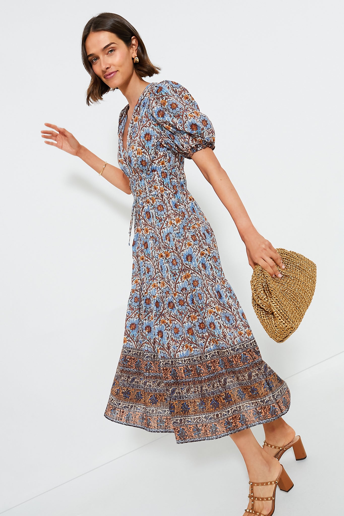 Feminine and elegant, the Caspia Ilana Dress is the perfect day-to-night style. Crafted from a lightweight shadow stripe with intricate, yet delicately hued florals that reflect the natural dyes from a vintage Persian botanical print, this midi features v-neck, puff sleeves, double drawstring ties at the waist, and has convenient side pockets. Finished with a tiered skirt, pair with ballet flats, espadrilles, or heels- this versatile beauty can go with anything and everything.