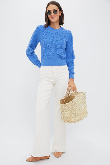 The Cerulean Embroidered Floral Frankie Sweater boasts a beautiful and bright blue. Featuring a semi cropped relaxed fit, embroidered detailing, and ribbed knit finishes, this sweater is sure to become a favorite this spring and summer season. Pair with white denim, flats, and a tote for easy daily wear, or style over your shoulder with a sundress for those unpredictable summer evenings!