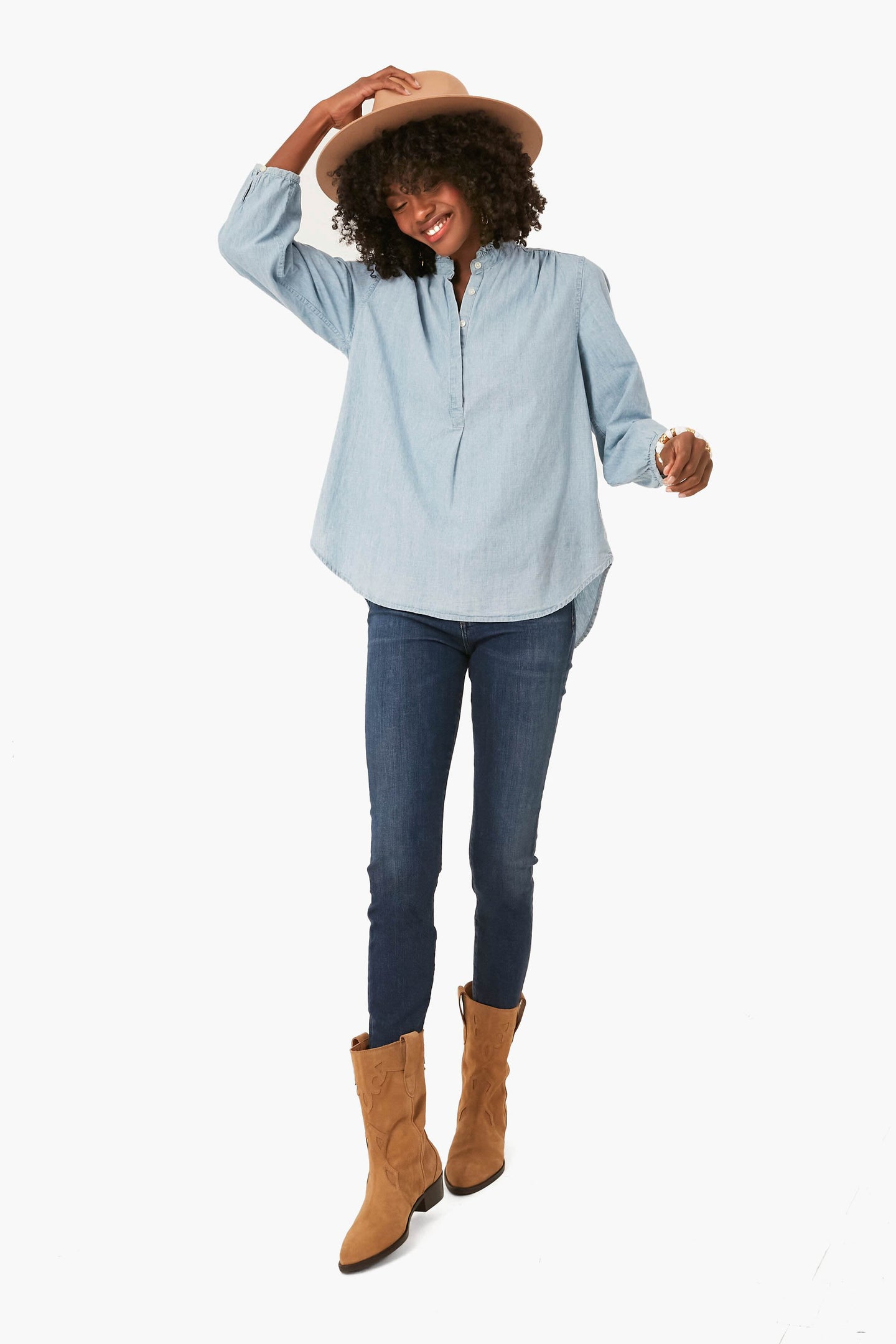 Effortless yet put-together, the Chambray Sara B Henley is a twist on the classic button-down. Feminine and casual, this top features a standup ruffle collar and a hidden button placket. Pair with denim and flats for work or brunch with friends.