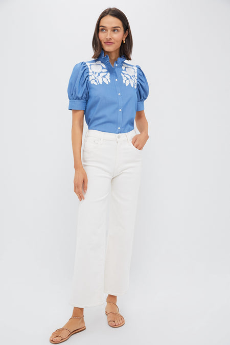 The best-selling Louisa silhouette now in a blouse! The Chambray & White Embroidery Louisa Blouse is a style we know you'll reach for time and time again. Perfect for resort wear, brunches, weekend adventures, and anything in between, the ways to style this blouse are endless. Featuring a feminine ruffle stand collar with short puff sleeves, this straight silhouette is easy to wear all day long. Pair it with white jeans, sandals, and a tote for an easy warm weather look!