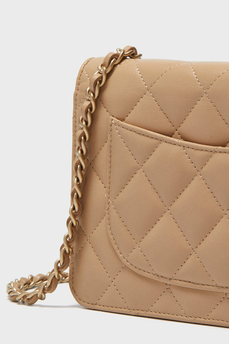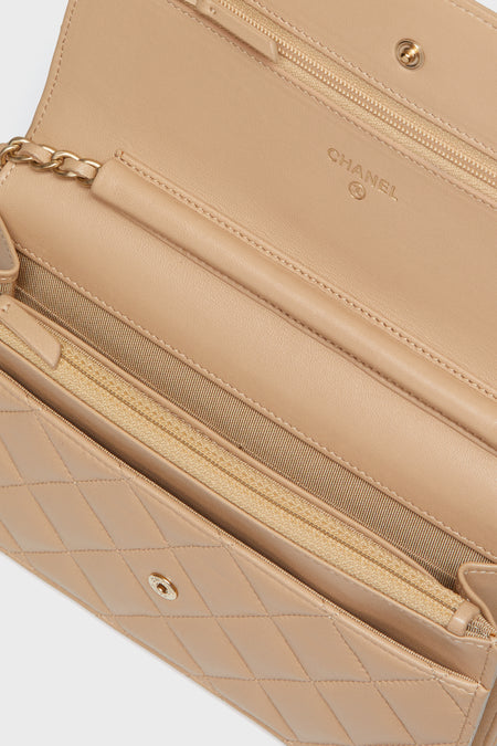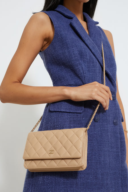 The Chanel Wallet on Chain was first introduced in the 90s, and has sense become an icon in the world of handbags. This CHANEL Beige Lambskin Quilted Classic Wallet On Chain is an ultra-chic bag that combines functionality with style for a timeless accessory. Boasting a shoulder chain strap, a clean silhouette, and both interior and exterior pockets, this is sure to be a go-to style in your closet. Pair with denim and a white tee for a casual weekend, or with an LBD and nude pumps for date nights.