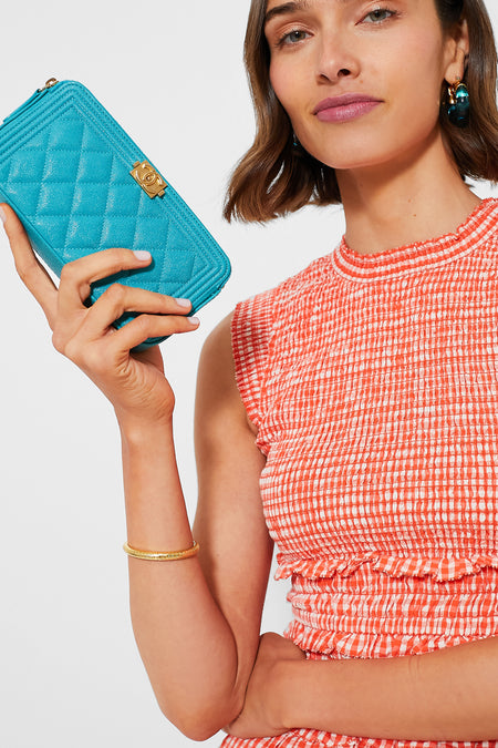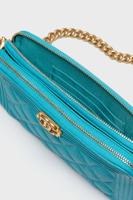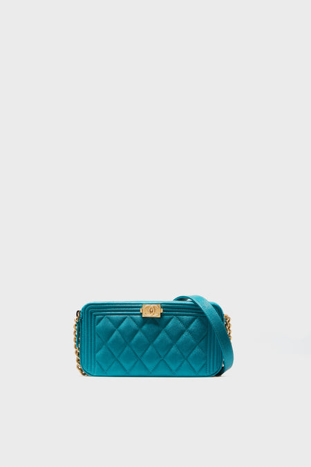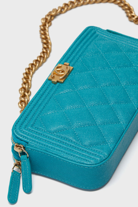 Add a pop of color and glamor to any look with the CHANEL Blue Caviar Boy Wallet On Chain. Perfect for days when you want to travel a little lighter but also want to look cool, classic, and collected, this is about to be your best friend — it's got an two main compartments, and an easy top zip closure to help keep your essentials safe and secure. Pair this darling little silhouette with a monochromatic outfit for an elevated ensemble, or with a day dress and a headband for a ladylike look.