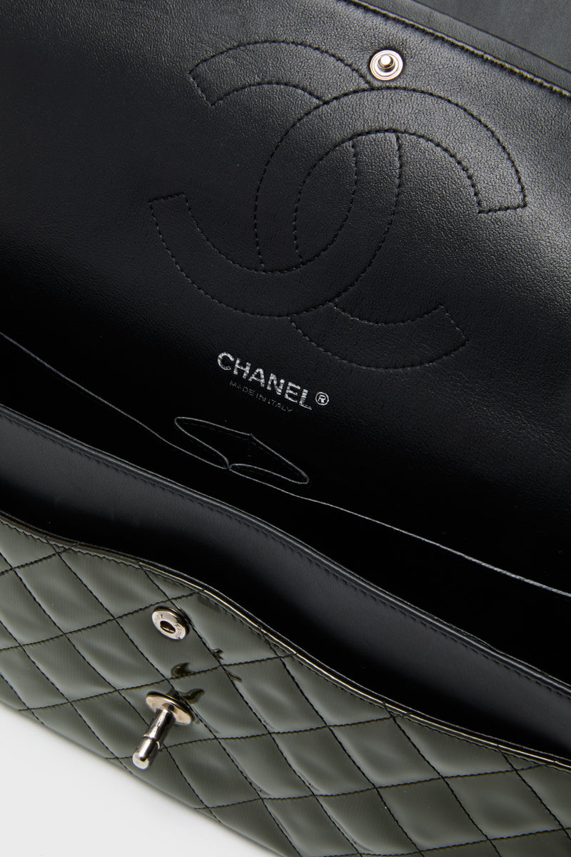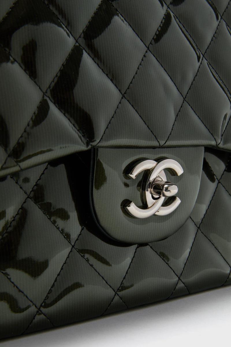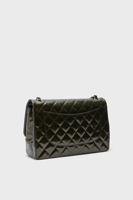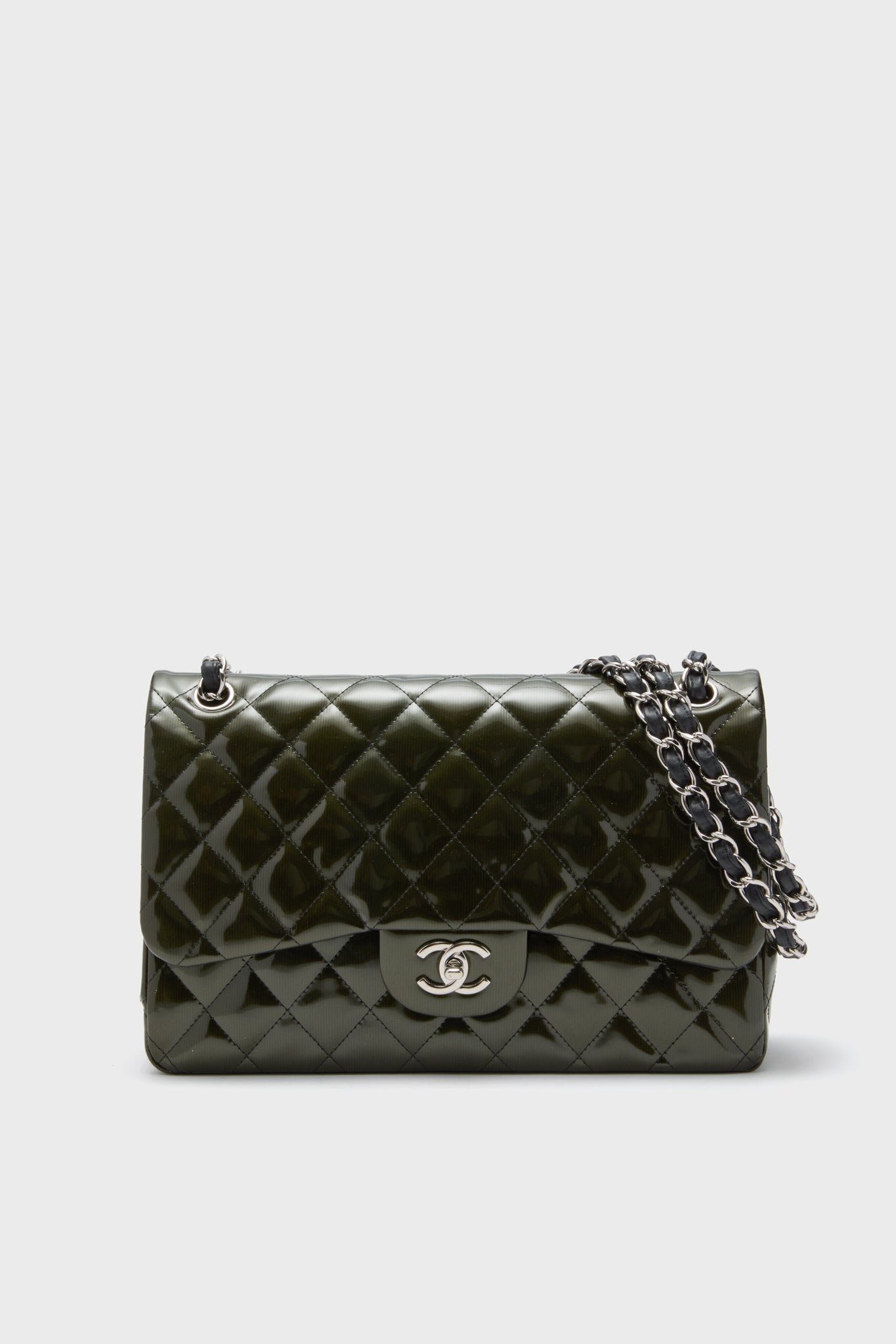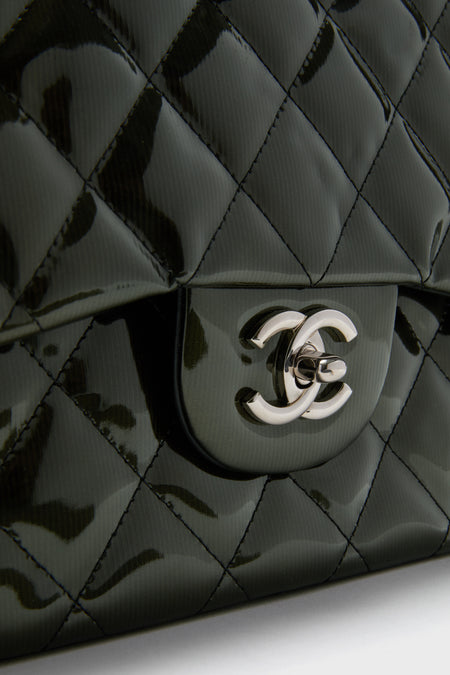 Elegant and chic, the CHANEL Olive Patent Leather Matelasse Coco Mark Shoulder Bag features a brand signature quilted patent leather, silver-tone hardware, and a chain link shoulder strap, this timeless piece will be a staple in your wardrobe for years to come. Perfect for everyday and nights out, grab your essentials and heels and you're ready to go!
