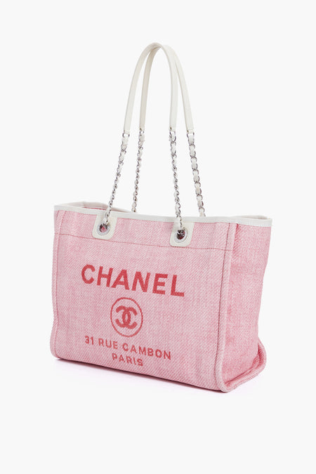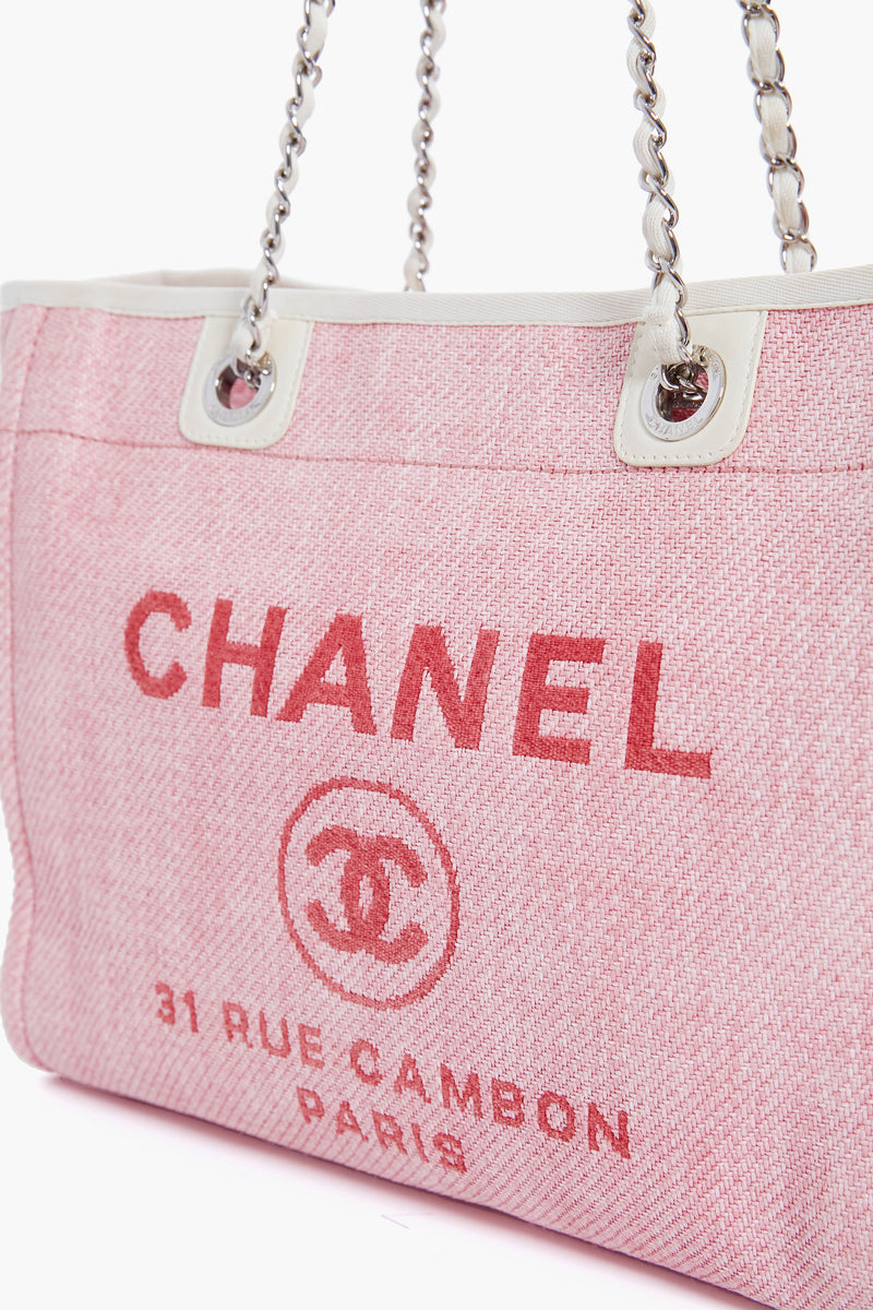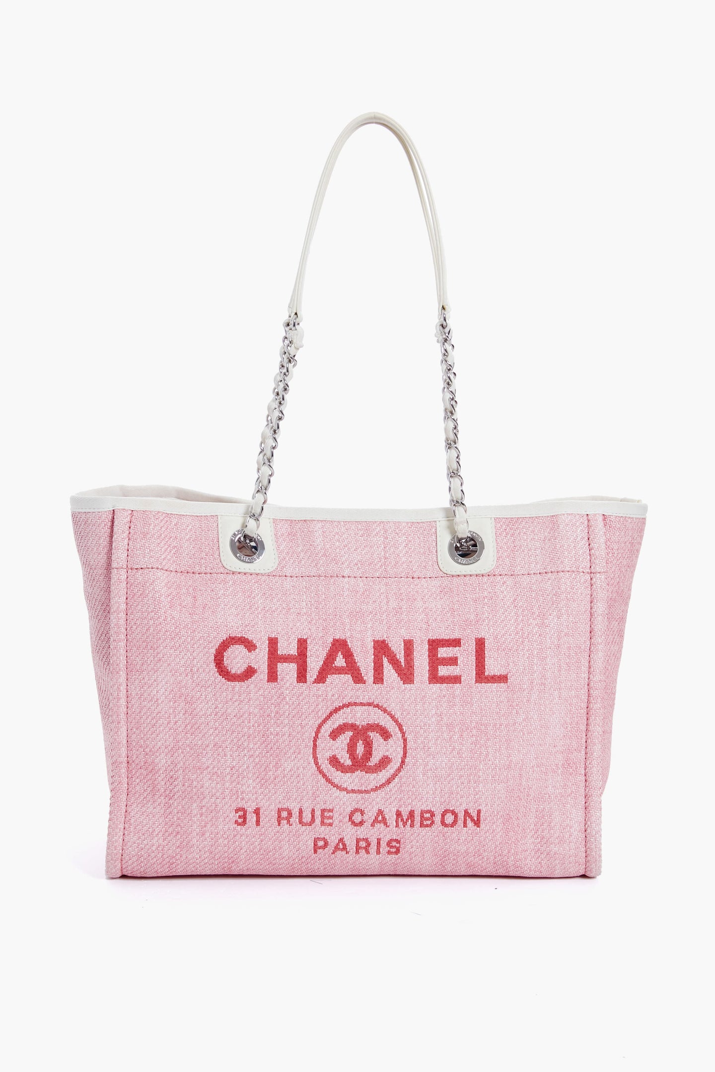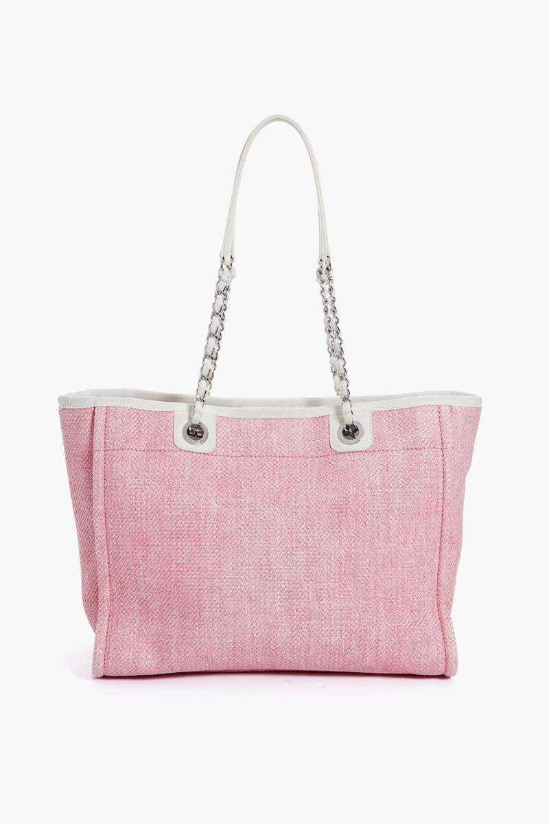 Named after the seaside resort in Normandy, the Deauville MM Chain Tote was first seen in Chanel's Spring Summer 2012 Collection. Polished yet casual, this mixed fiber canvas bag features a magnetic snap closure, two interior flat pockets, and a zip pocket, making it a perfect everyday bag for an organized girl-on-the-go. The front is adorned with the interlocking C logo, as well as "31 Rue Cambon", the address of Coco Chanel's apartment and her first boutique in Paris, which lends historical significance to this timeless silhouette. Ideal for the modern woman who loves classic fashion and function in their everyday life, this large, slouchy handbag is a beautiful addition to any collection.
