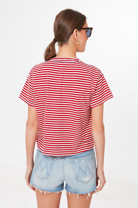 In a charming candy striped print, the Chemise A Rayures The Big Baggy Mid Tee is a great addition to any closet. Everything you want from an elevated basic, this is the perfect tee silhouette—it features a crewneck, dropped shoulders, and a slightly cropped hem that hits right at the top of high waisted bottoms. Endlessly versatile, this top is great with shorts and sandals on beachy getaways, or with denim and a cardigan for an effortless cool girl look to grab coffee with friends.