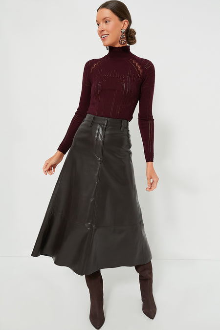 Crafted from panels of luxe leather, this high rise skirt pairs perfectly with all of your cool-weather accessories. We are styling it with boots and a sweater or a button down and loafers!