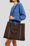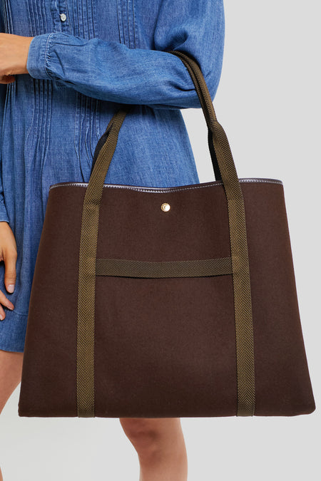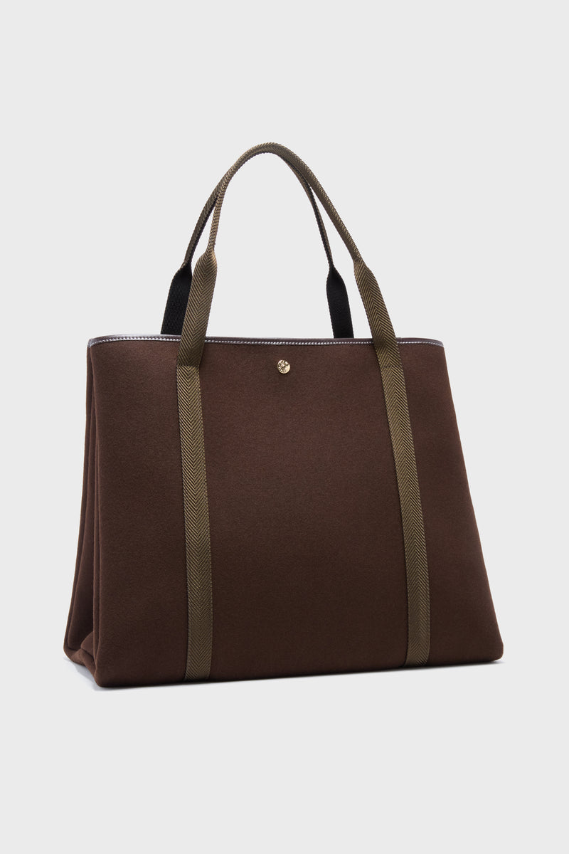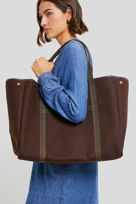 The Chocolate Flannel Traversee XL Tote provides all of the space and style you need to get your essentials from point A to point B. Crafted from a luxe flannel with sturdy yet chic contrast top handles that can be worn on your shoulder or carried in hand, this silhouette can be folded inward for a smaller shape or pushed open for more room. Perfect for a quick trip to see your girlfriends or a romantic getaway, this tote will make bustling around just that much easier.