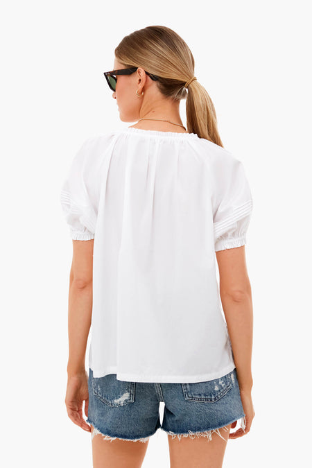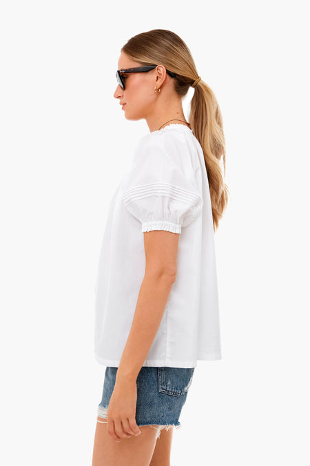 The Classic White June Blouse is crafted from lightweight cotton. Detailed with short puff sleeves, a button front, and ruffle collar, this top is effortlessly chic. Pair with jean shorts and leather accessories for a coastal-cool look.