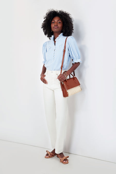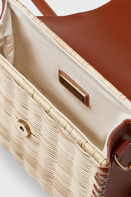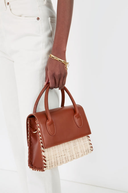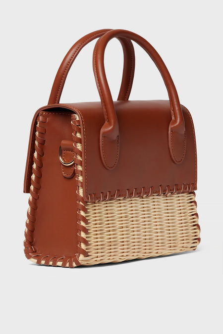 Timeless in shape, yet plenty modern due to a mixed-material composition that brings a fun edge, the Cognac Caspian Bag is the epitome of elevated summer accessorizing. Top handles and an optional crossbody strap give you multiple options of how to carry it, while a rich brown hued vegan leather contrasts with the natural woven basket-texture to create a stunning visual effect. Pair with a classic button down and white denim for a chic everyday styling, or with a printed dress to take things up a notch.