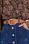 Crafted from textured calfskin leather with a sleek metal buckle for an adjustable fit, the Cognac Dara Buckle Belt offers a timeless element to any outfit. Pair with leather pants or denim, from desk to drinks, brunches to dinner parties!