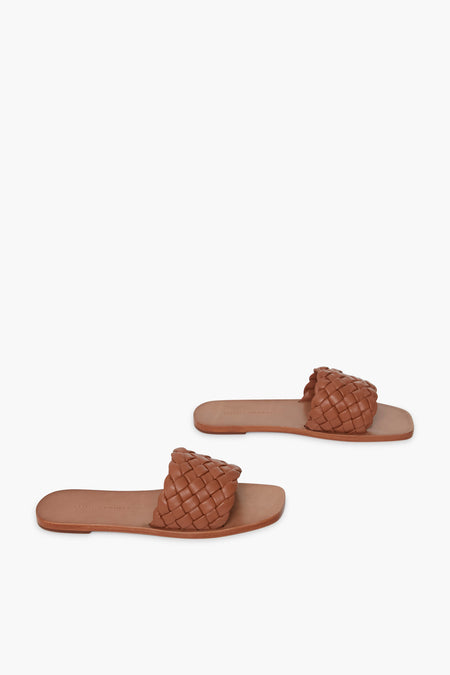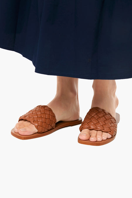 The Cognac Nappa Lorainne Sandals are made from woven dark tan leather with a plank footbed. Perfect for seaside vacation strolls, these slides will pair easily with any outfit!