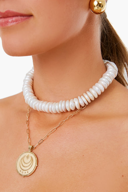 The Coin Pearl Okeanos Necklace is a little touch of luxury and sass for your everyday jewelry style. Crafted in 24k gold-plated brass with coin pearls, this unique piece pairs well over a turtleneck or with a low neckline top to let the necklace shine.
