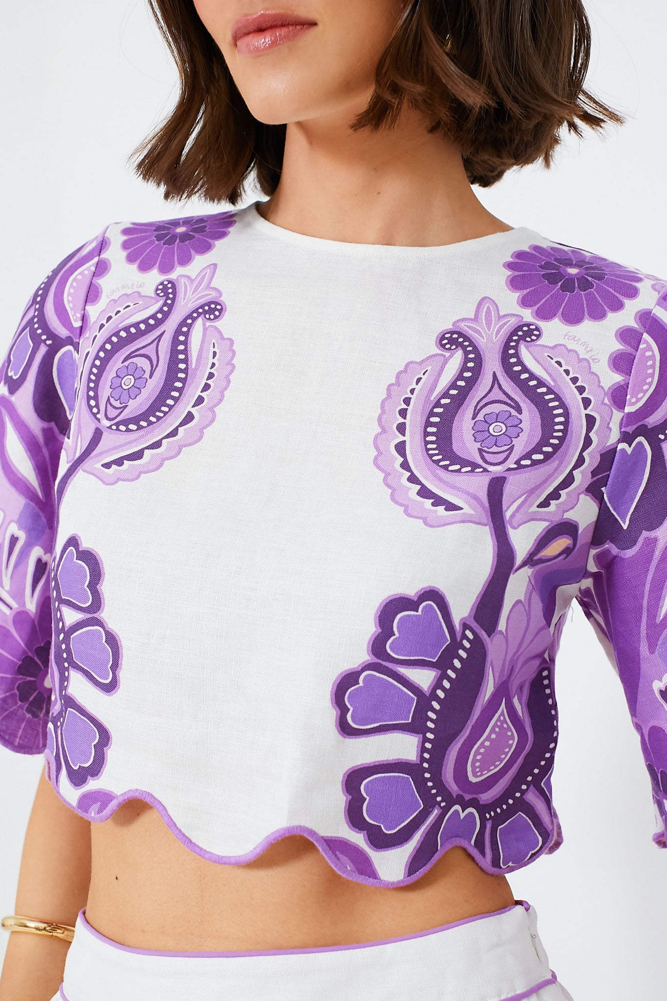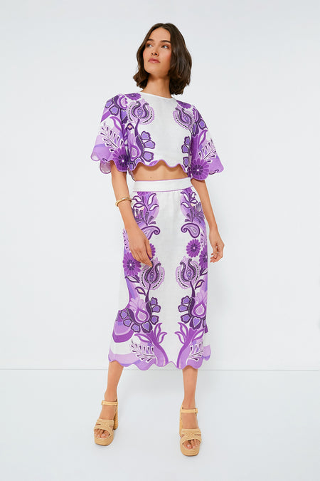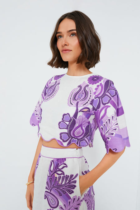 Infuse your wardrobe with a touch of Brazilian flair with the Color Festival Cream Cropped Blouse. Crafted from responsibly sourced materials, this crop top dazzles with its vibrant purple folk-inspired patterns that complement the natural cream base. A round neckline gracefully frames the face, while the floaty, cropped silhouette boasts playful flared sleeves that add a whimsical movement to every gesture. Perfectly paired with high-waisted bottoms or matching Color Festival Cream Midi Skirt, this blouse celebrates the joyous spirit of Farm Rio's unique style ethos.