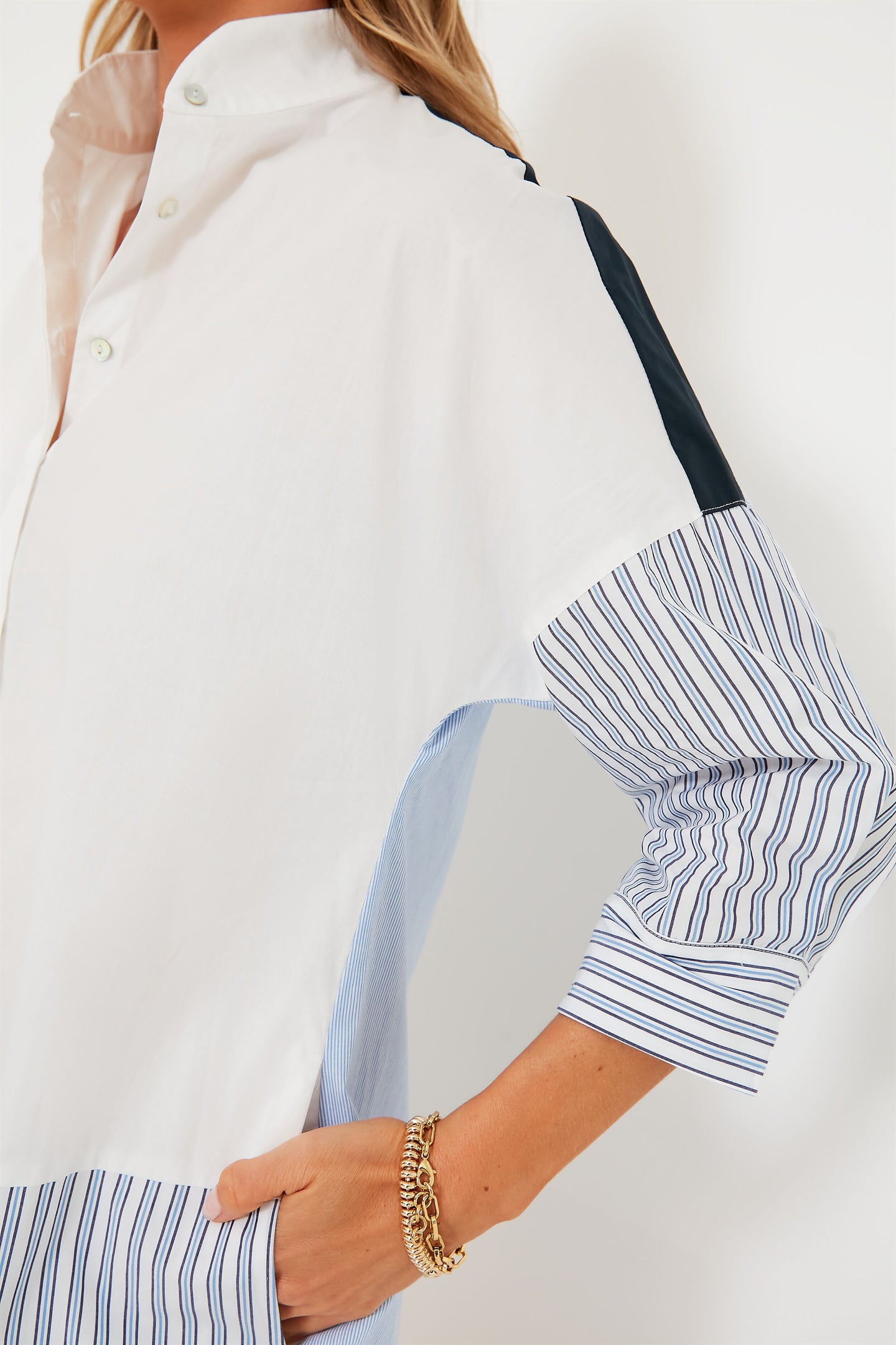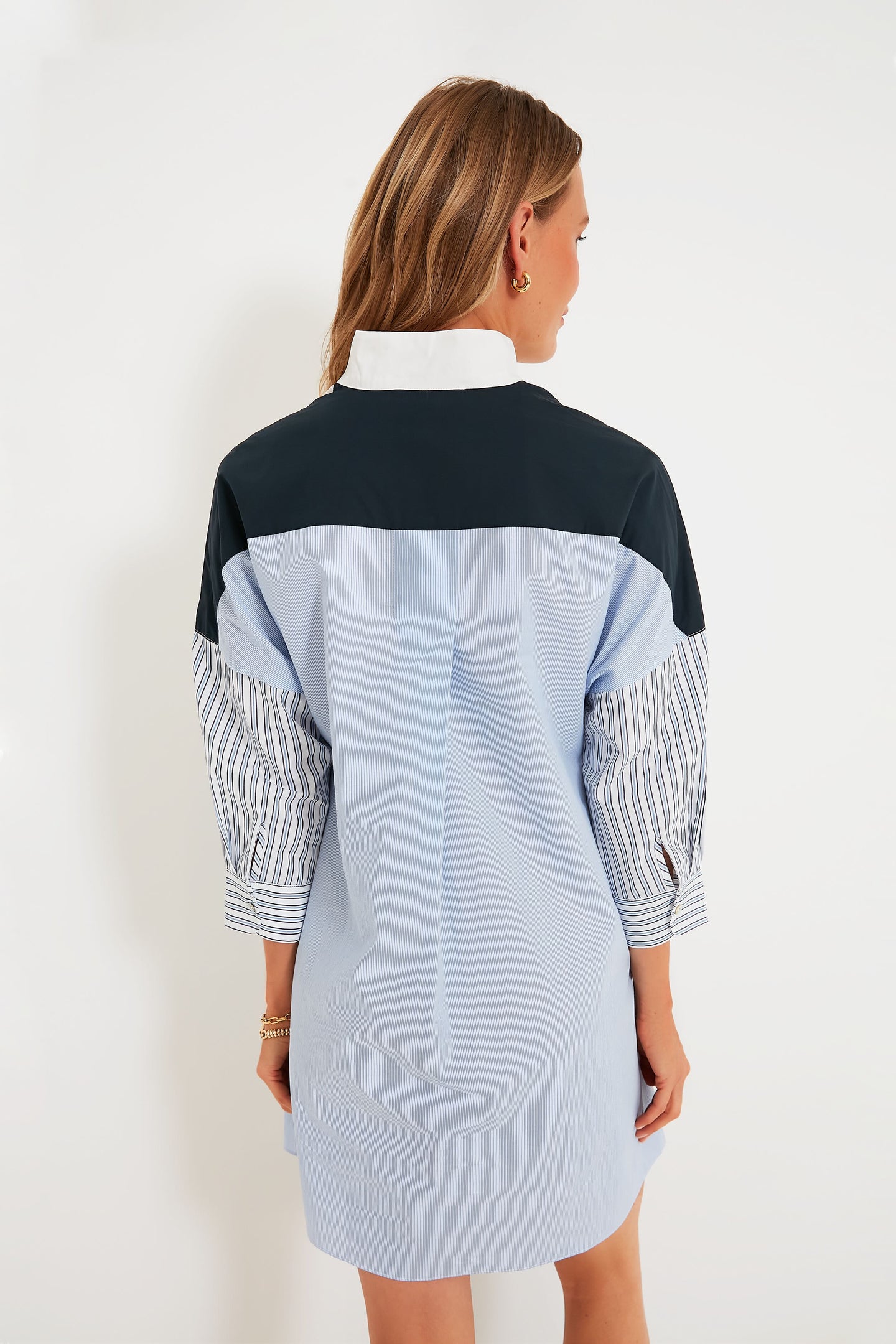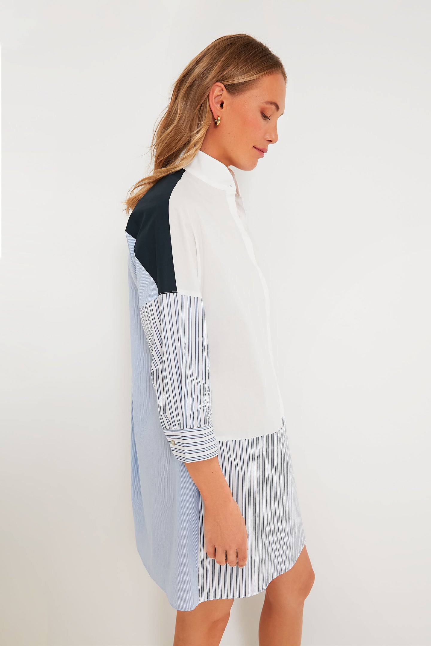 Perfect for achieving that "I stole my boyfriend's shirt" style, the Colorblock Burnell Shirt Dress features charming pops of white, blue, and stripes that create an intriguing mixed media look. Thoughtfully made with details you are sure to love, this mini has an elegant stand collar, feminine three-quarter length sleeves with button cuffs, a concealed partial placket at the front, and side seam pockets. We are wearing this number on repeat this season, from park picnics to casual Fridays in the office. Add sneakers, sandals, or loafers, maybe a touch of gold jewelry, and you've got a fresh outfit formula!