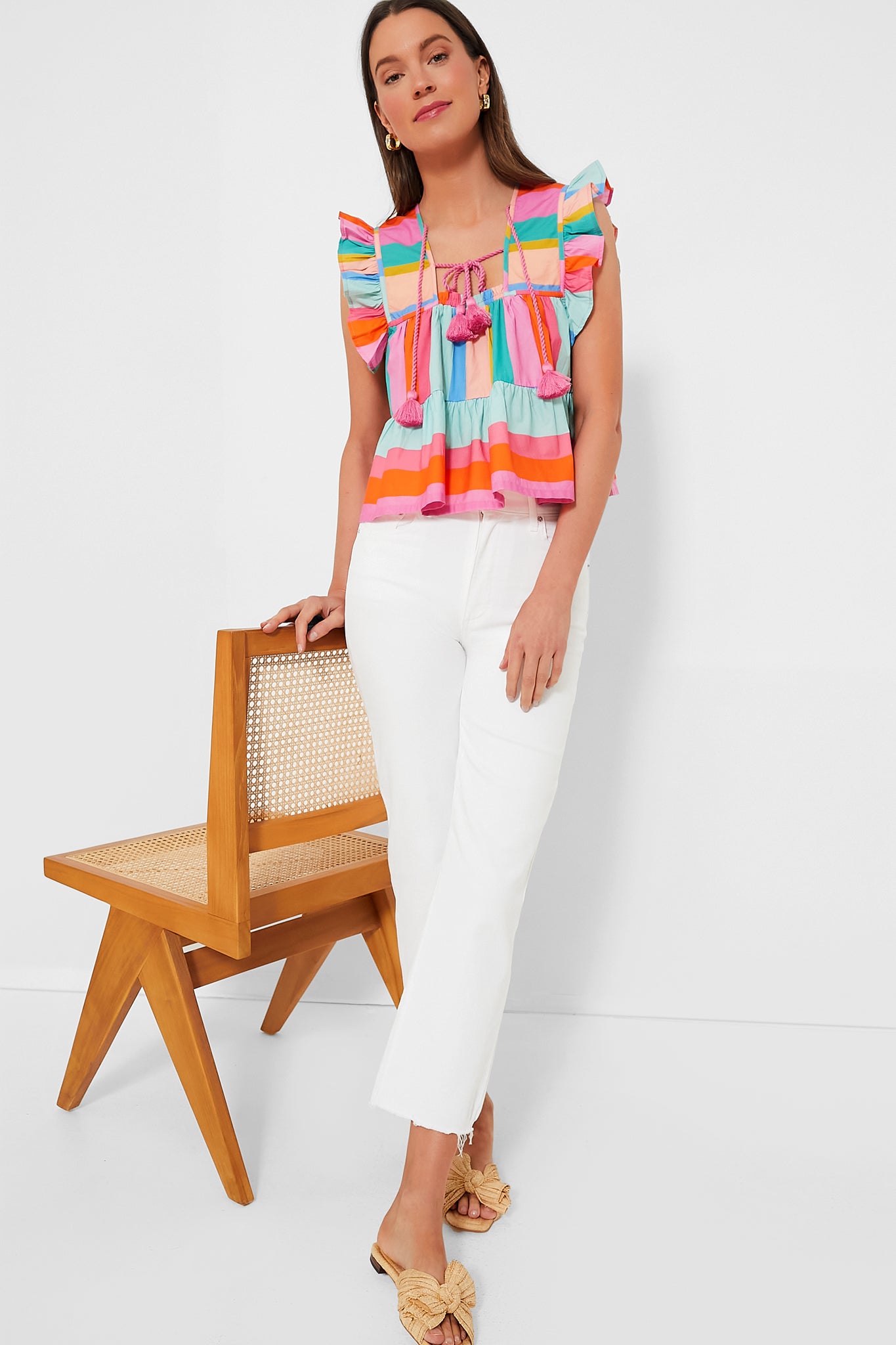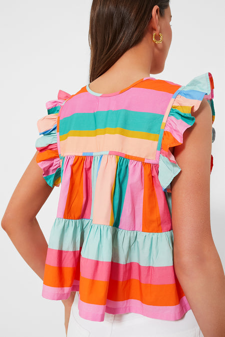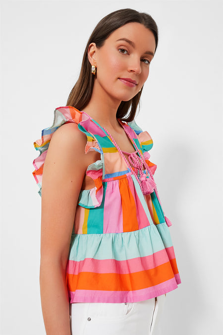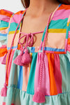 The Confetti Stripe Chelsea Top is a party in a top, featuring fun details such as ruffle sleeves, a narrow square neckline with tassel ties and a vibrant striped pattern. Pair with denim shorts and sandals or white pants and sneakers- this is the ultimate everyday top!