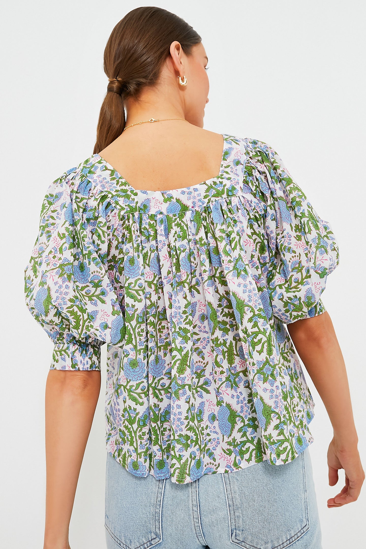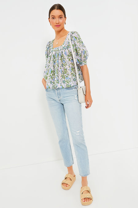 We love the Cornflower Blue Palladio Viti Top for its easy elegance. This feminine silhouette boasts a square neckline, short puff sleeves, and gathering along the neckline to create an A-line body. The enchanting floral pattern instantly transports us to a summer garden. Pair with denim shorts and sandals for a picnic, or with pants and ballet flats for brunch.