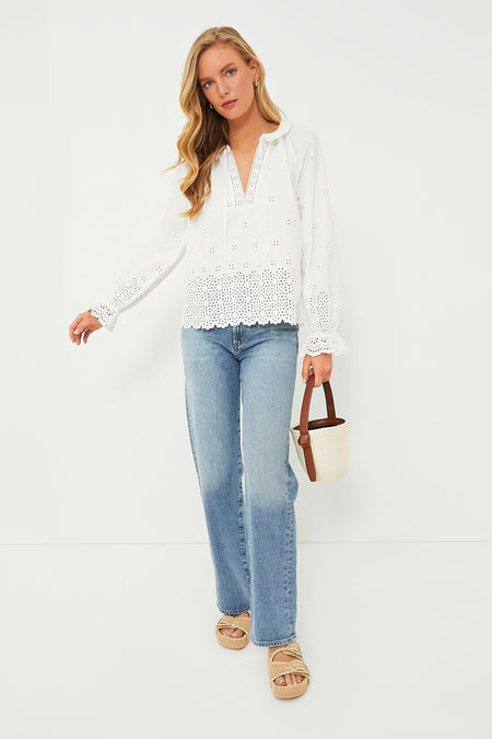 The Cowrie Alora Blouse is the elevated boho style we have been dreaming of. Full of feminine details like ruffled collar with self-tie detail, long blouson sleeves, and eyelet embroidery across the bodice, this is a true staple in any wardrobe. Perfect for sunny brunches or seeing the sites in a seaside town, pair with denim and sandals for an easy outfit formula or with shorts and a basket bag for a statement look.