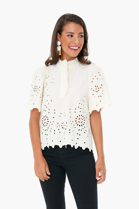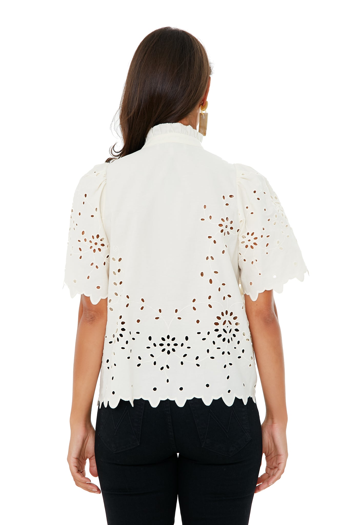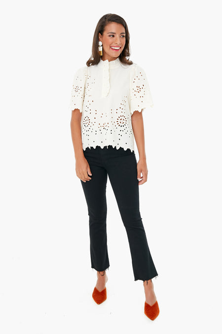 The Fiona Short Sleeve Top features semi-sheer eyelet detailing and voluminous sleeves for a feminine, yet neutral, everyday top. We are pairing this with dark wash jeans and a statement shoe for a look that will take you from errands to drinks with friends.