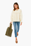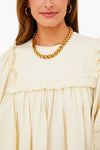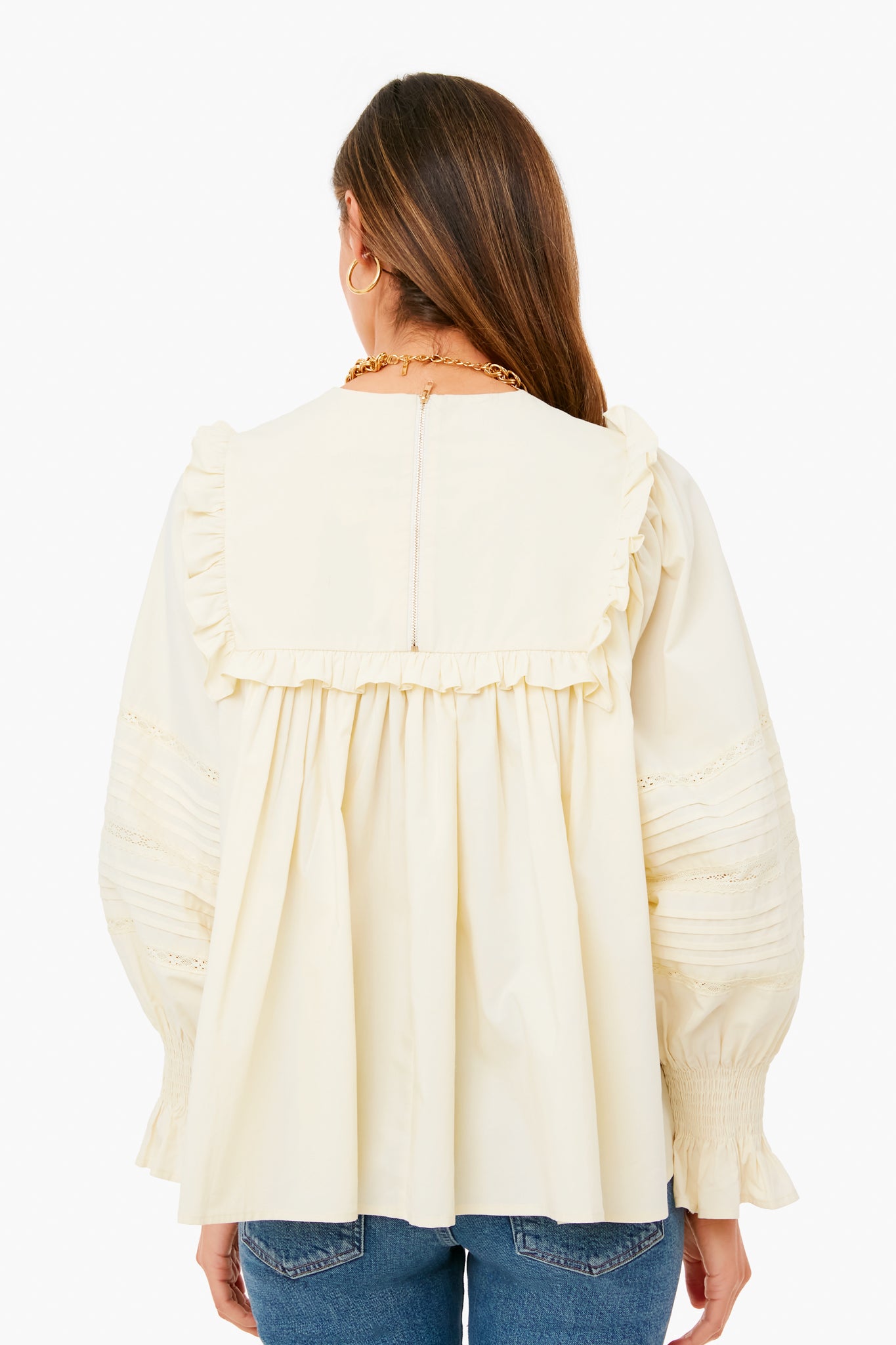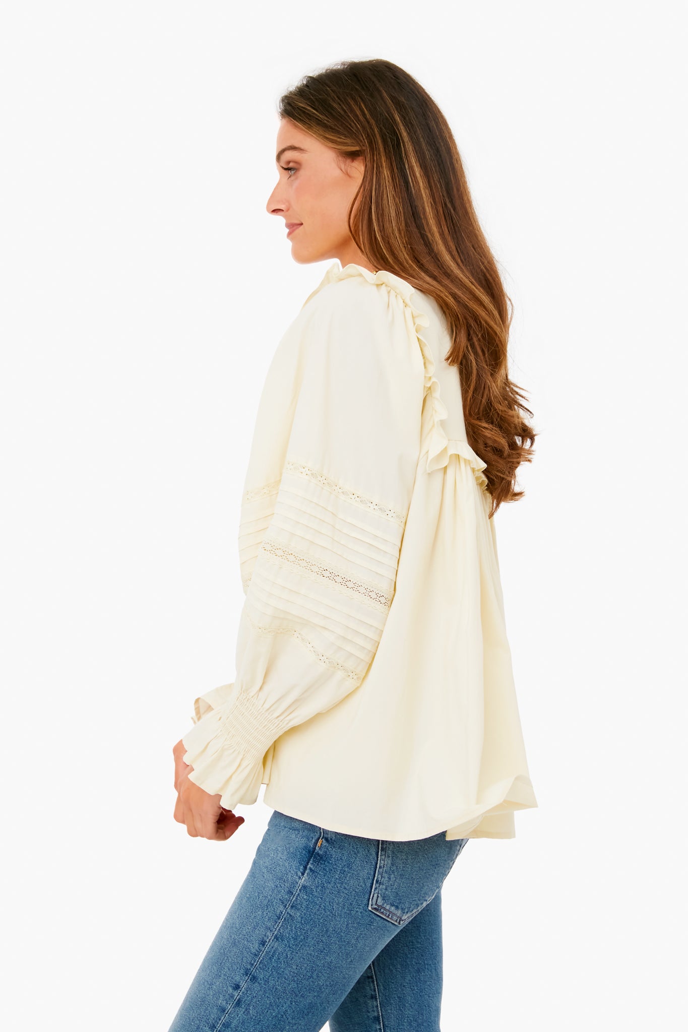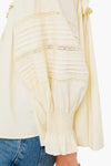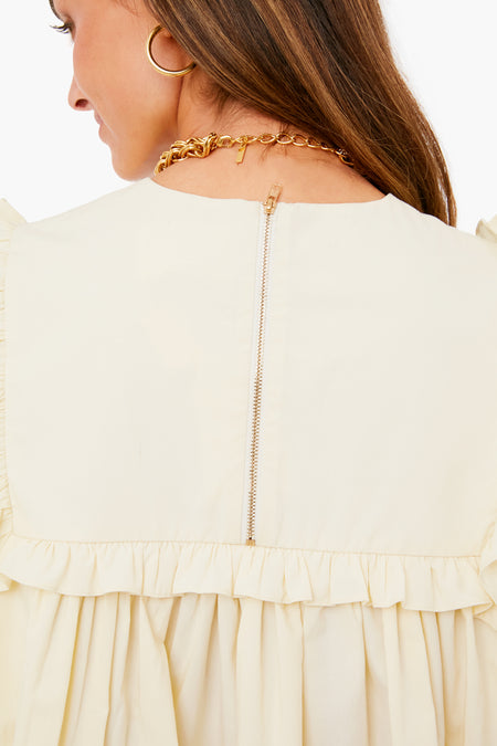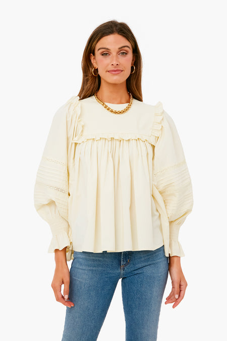 The Cream Fleur Top is made from organic cotton and lace. This style has voluminous puff sleeves, a ruffle bodice, and a crewneck fastened with a zipper down the back. Pair with denim and gold jewelry from the office to dinner with friends.