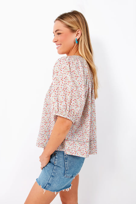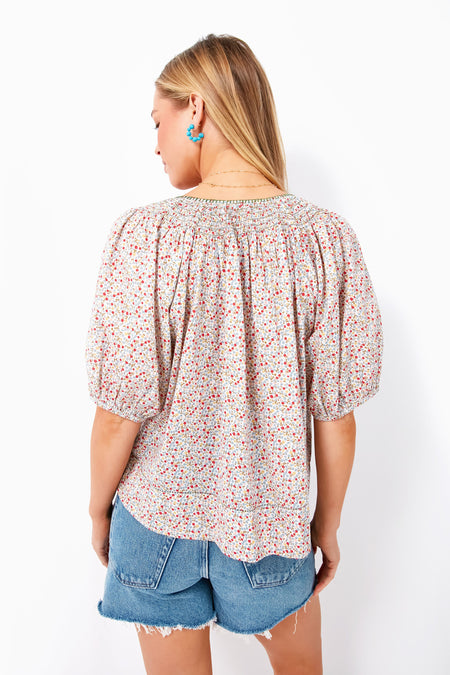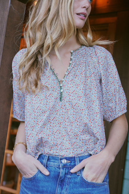 The Cream Mini Wild Flower Print The Honey Top is simple and sweet. This blouse features short puff sleeves with an elasticated opening and a delicately smocked neckline for that added extra detail. We love the quarter length placket because it is dotted with tiny buttons to wear open and easy or closed and crew shaped. And we can't forget about our favorite detail- its finished with a delicate contrast hand-done whipstitch that adds to the charm. With a relaxed fit that looks great tucked or untucked and a perfect for spring print, we are adding denim and sneakers for a casual cool feel.