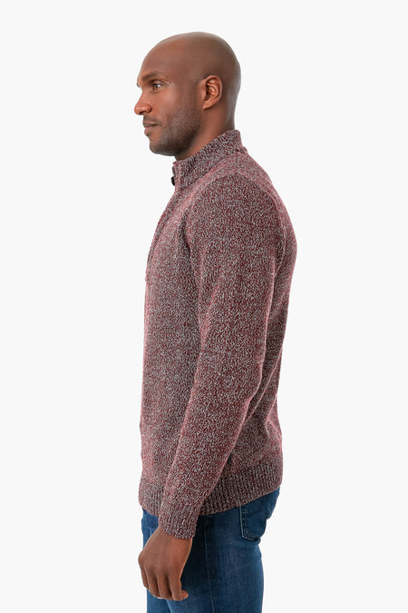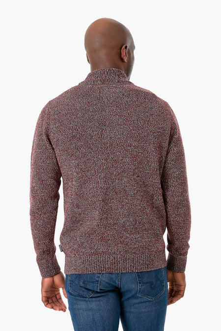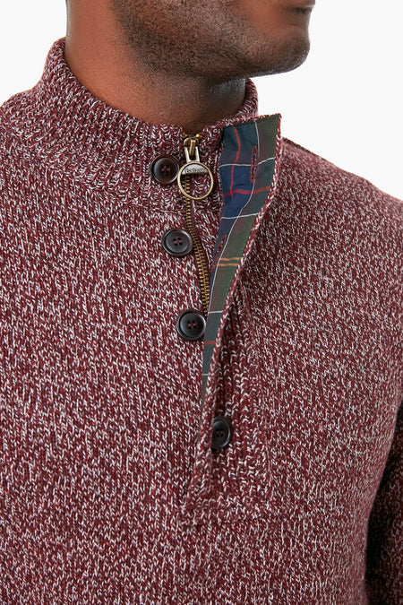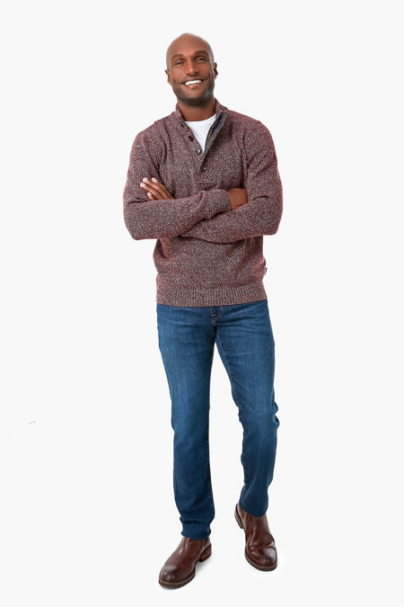 The Crimson Marl Sid Half Zip is a stylish and versatile men’s jumper crafted from a luxurious lambswool blend. This warm sweater is the perfect layering piece. Ribbing and a front zip closure with buttons at the neck add subtle yet eye-catching extra details. Pair with a button-down and slacks for a classic look.