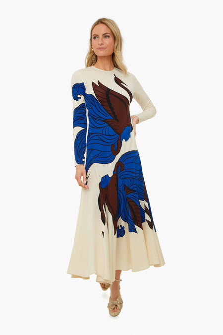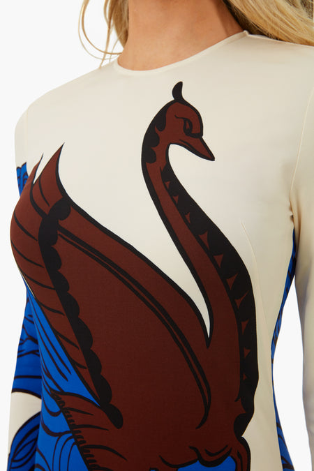 A celebration of freedom and elegance, this fluid jersey dress evokes the carefree mood of the season. The Lady Swan print is an optical illusion– from one angle it's a woman, from the other, a swan. The Crane print captures the striking bird as an Art Deco-inspired graphic. Cranes, like swans are a symbol of grace and strength. This elegant piece moves easily from day to night, paired with heels and statement earrings.